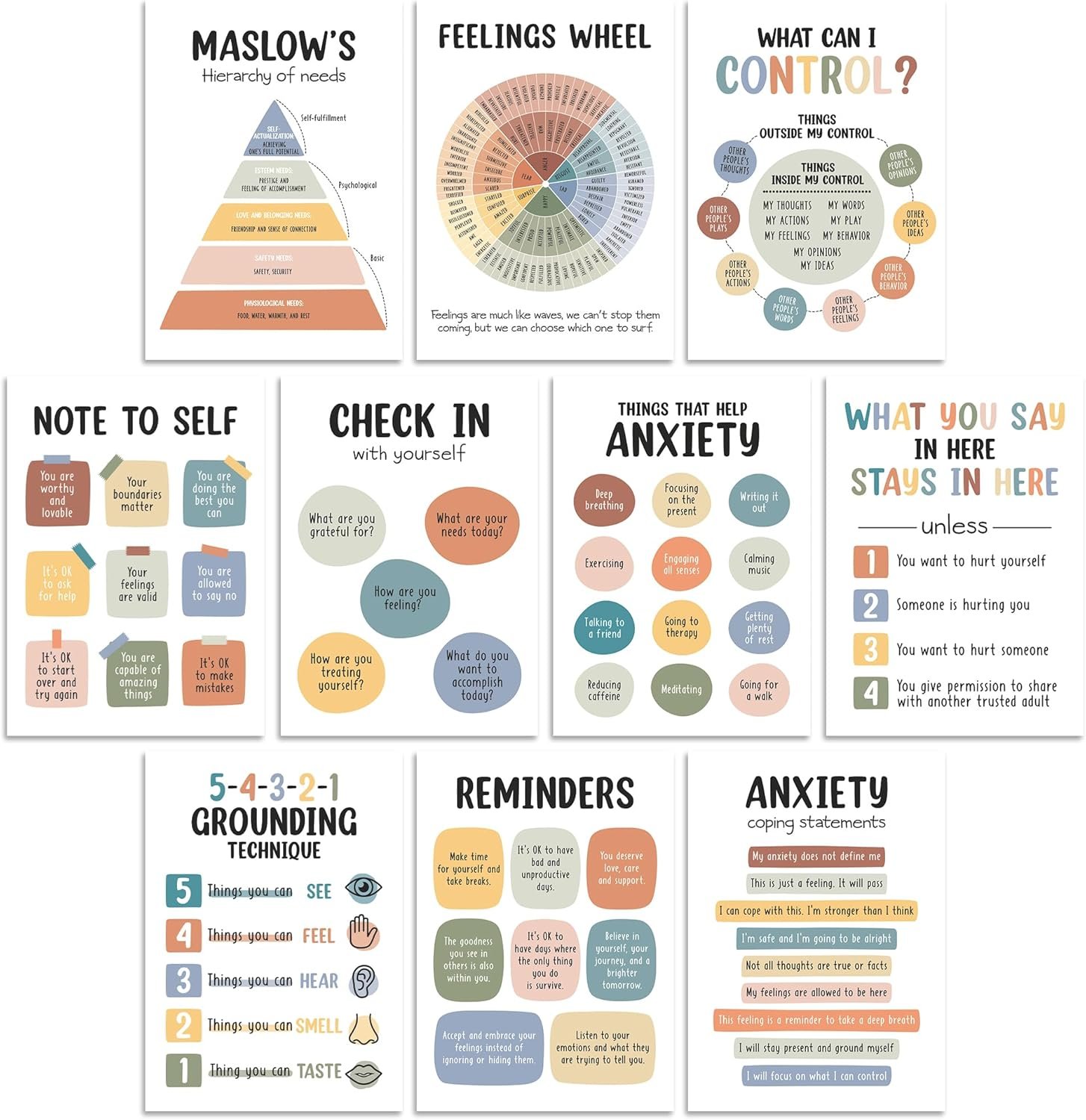 Support In Reducing Stress And Enhancing Mental Health: Feelings Wheel Poster, Posters About Self-care, Anxiety Coping Statements, or 5-4-3-2-1 Grounding Technique can help viewers reduce stress, Anxiety, and improve their mental health – Provides tools and tools to reduce stress and anxiety, helping users to manage their own psychology and mental health more effectively.