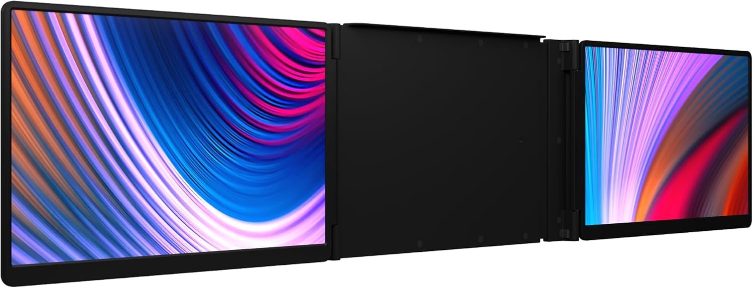 Adjustable Ergonomic Stand: Features a heavy-duty built-in, tiltable stand with up to 180° adjustment across a 38.8 cm width, providing flexible viewing angles for comfortable use at desks, meetings, or during travel. The stand holds the weight of the monduo screens and won’t effect the hinge of your laptop.