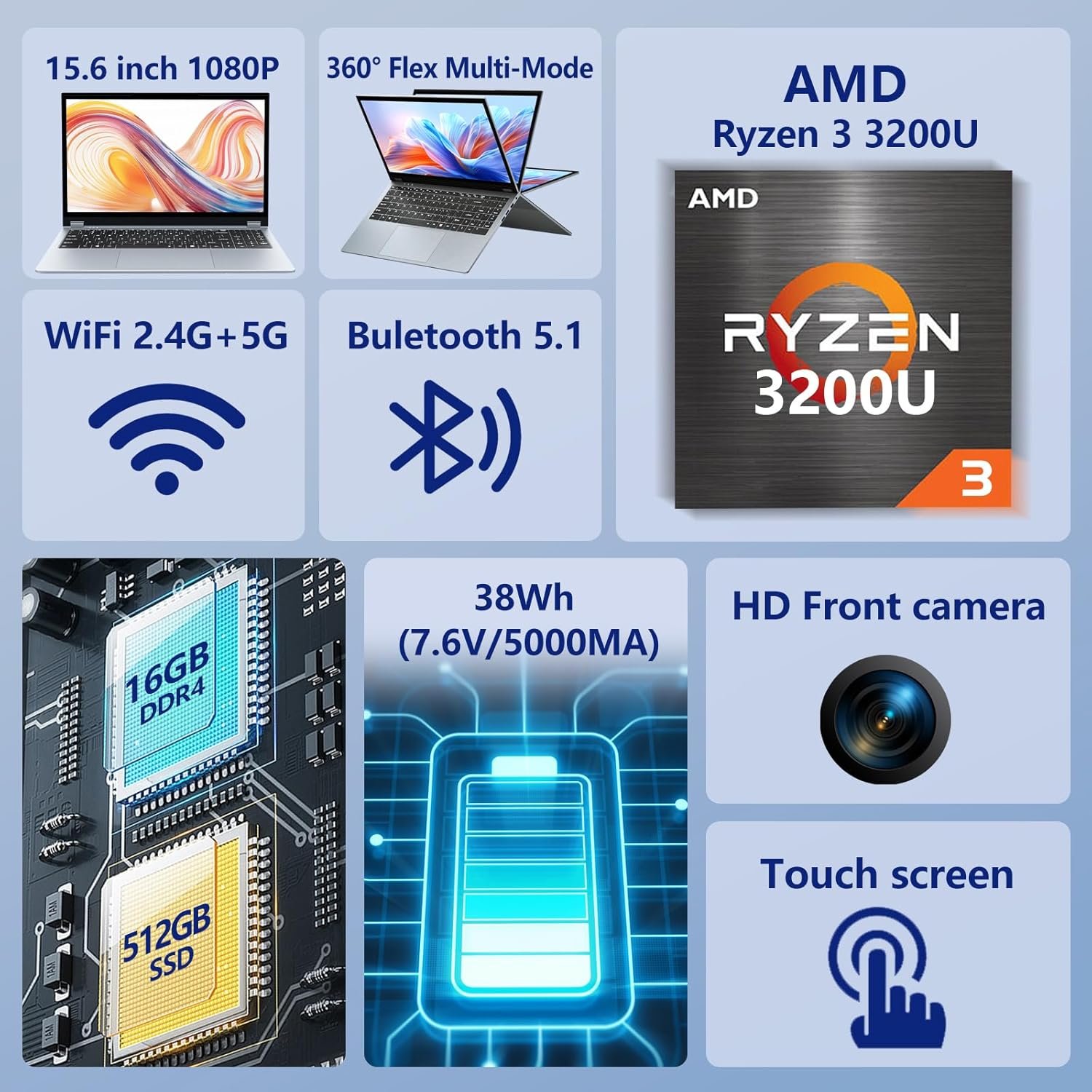 Powerful AMD Performance: 2 in 1 laptop equipped with an AMD Ryzen 3 3200U processor (up to 3.5GHz) and AMD Radeon Graphics, this AMD laptop computer delivers smooth multitasking and efficient performance for work, studing, and entertainment. Whether you’re a student, professional, or creative user, this laptop 16GB RAM ensures fast, lag-free operation.