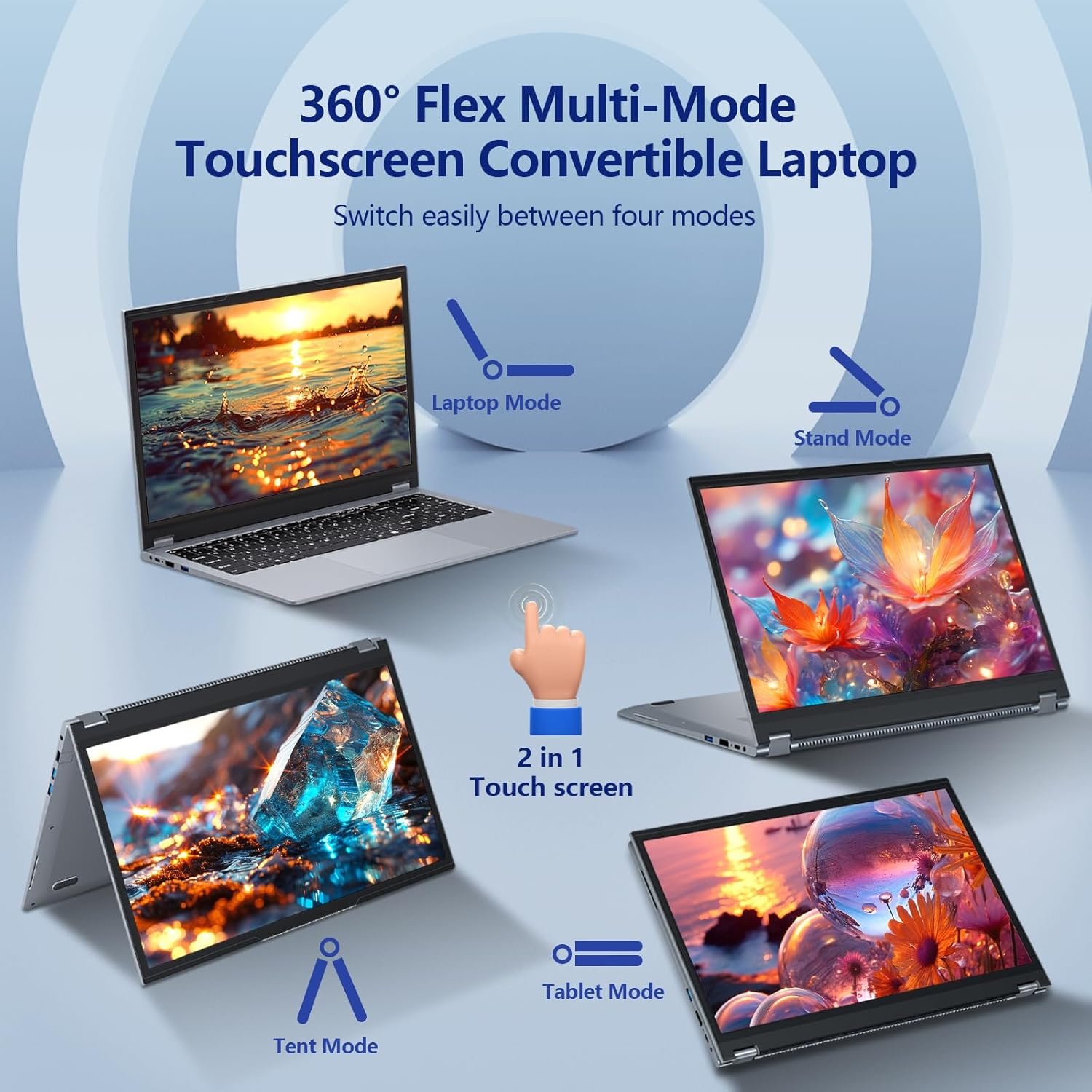 Unique Laptop Design: This 2025 laptop is equipped with a 360° hinge, which can be easily switched between laptop, tablet, tent and stand modes. Share and communicate freely with friends, colleagues and family at any time. Convertible laptop can be used flexibly as a 2-in-1 laptop or a traditional laptop, making it a perfect foldable laptop.