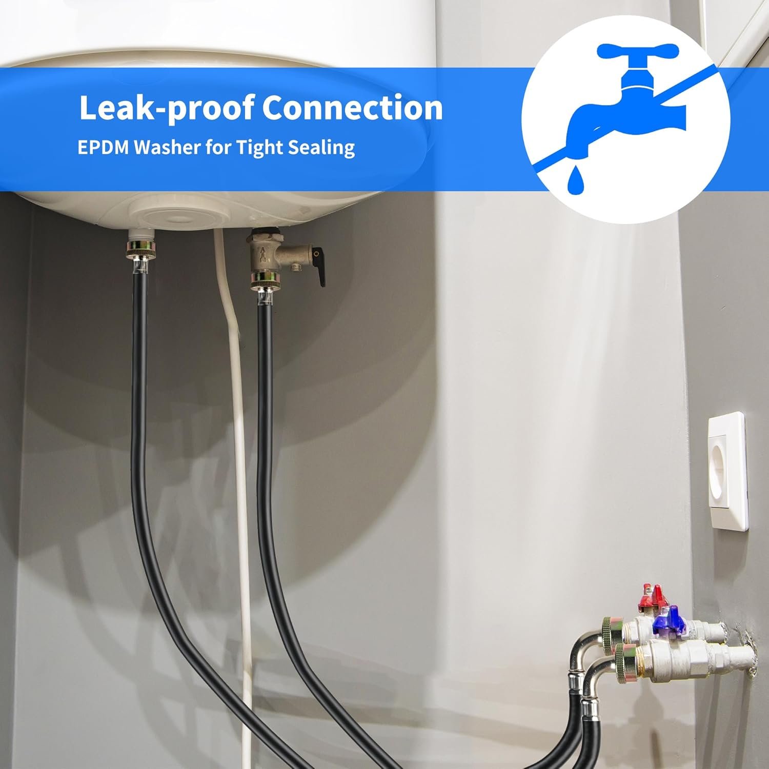 2 Pack 8 FT Rubber Washer Hoses with 90 Degree Elbow, Black Burst Proof Washing Machine Hose, Hot and Cold Water Connection Inlet Supply Lines, 3/4″ Fittings Washing Machine Fill Hose Feature: -For any standard washing machine and supply line -Multi-layer design -Resistance to extreme pressure and strong bearing capacity Specification: Material:PVC material Color: Black Length: 8 Ft End Diameter:Inner diameter of 3/4 inch Package includes: 2x Rubber washing machine hoses