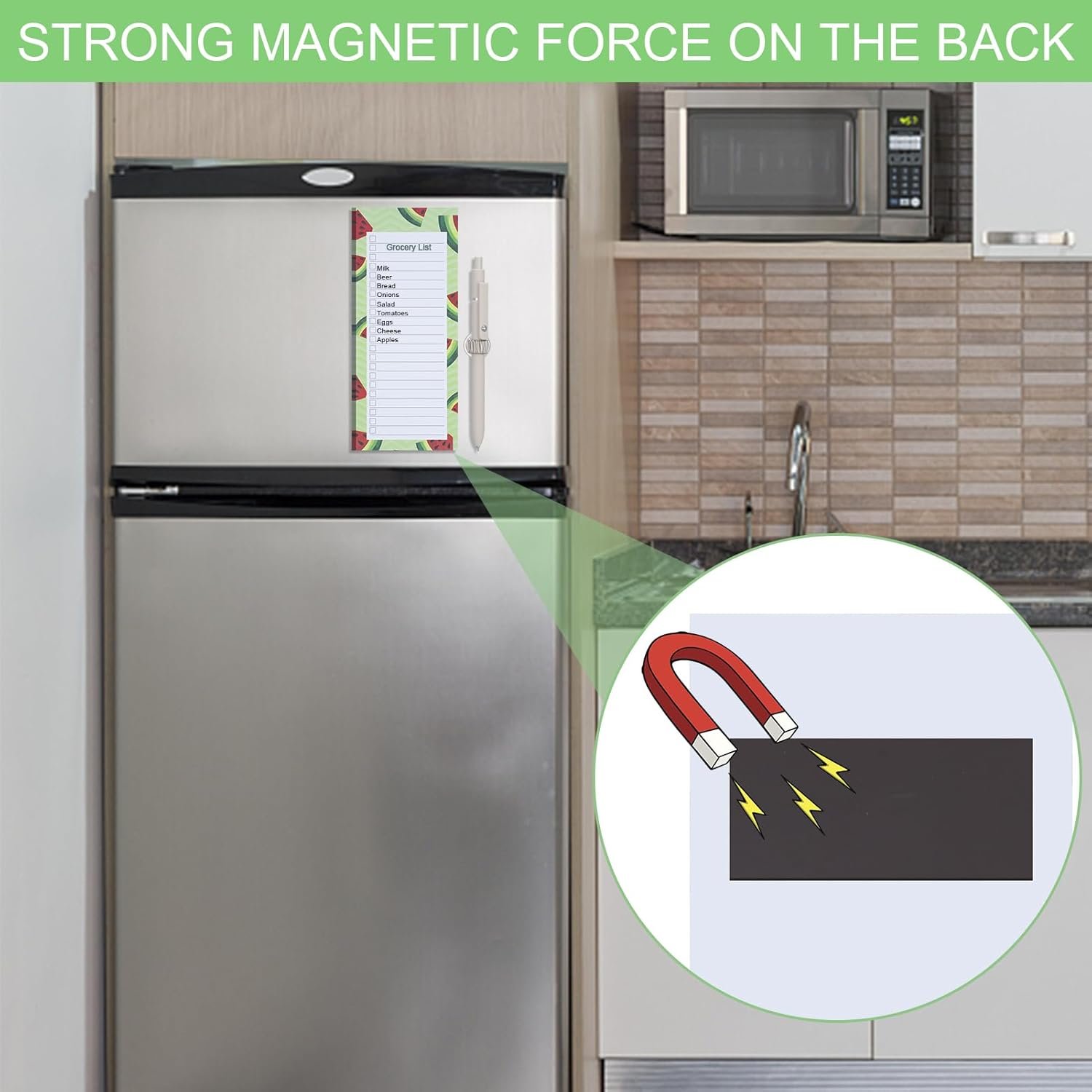 Magnetic Back: The refrigerator magnetic notepad and the magnetic pen clip have magnetic strips on the back, just put the notepad and the pen clip on the refrigerator case. (Tips: Can only be used on metal refrigerator doors and casings)