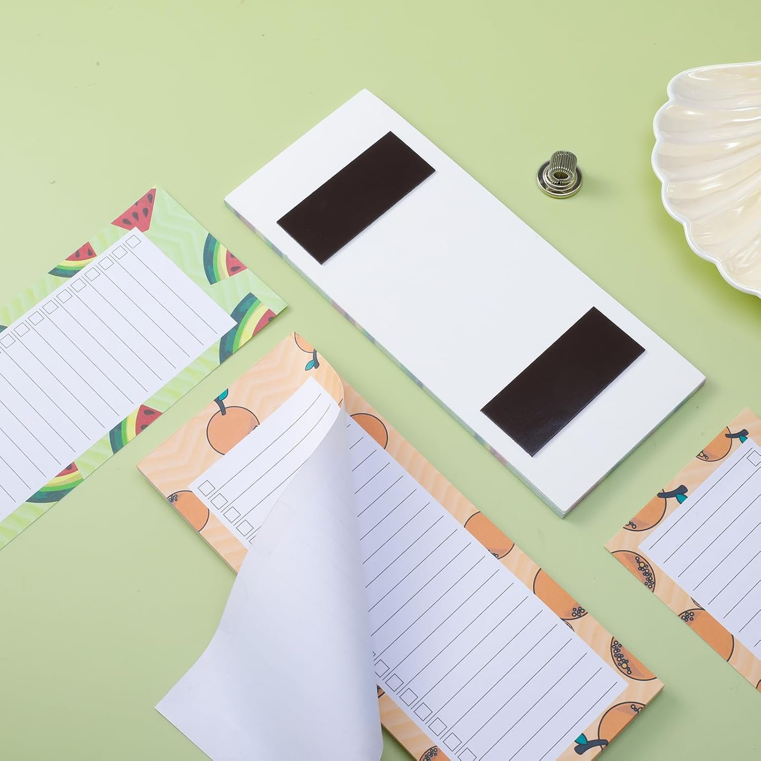 Design: The magnetic shopping list pad is designed with cute summer watermelon and orange patterns, adding a touch of coolness to the hot summer day. The magnetic pen holder adopts the spring principle design, you only need to insert the pen into the pen holder, and the elastic force of the pen holder will firmly fix the pen