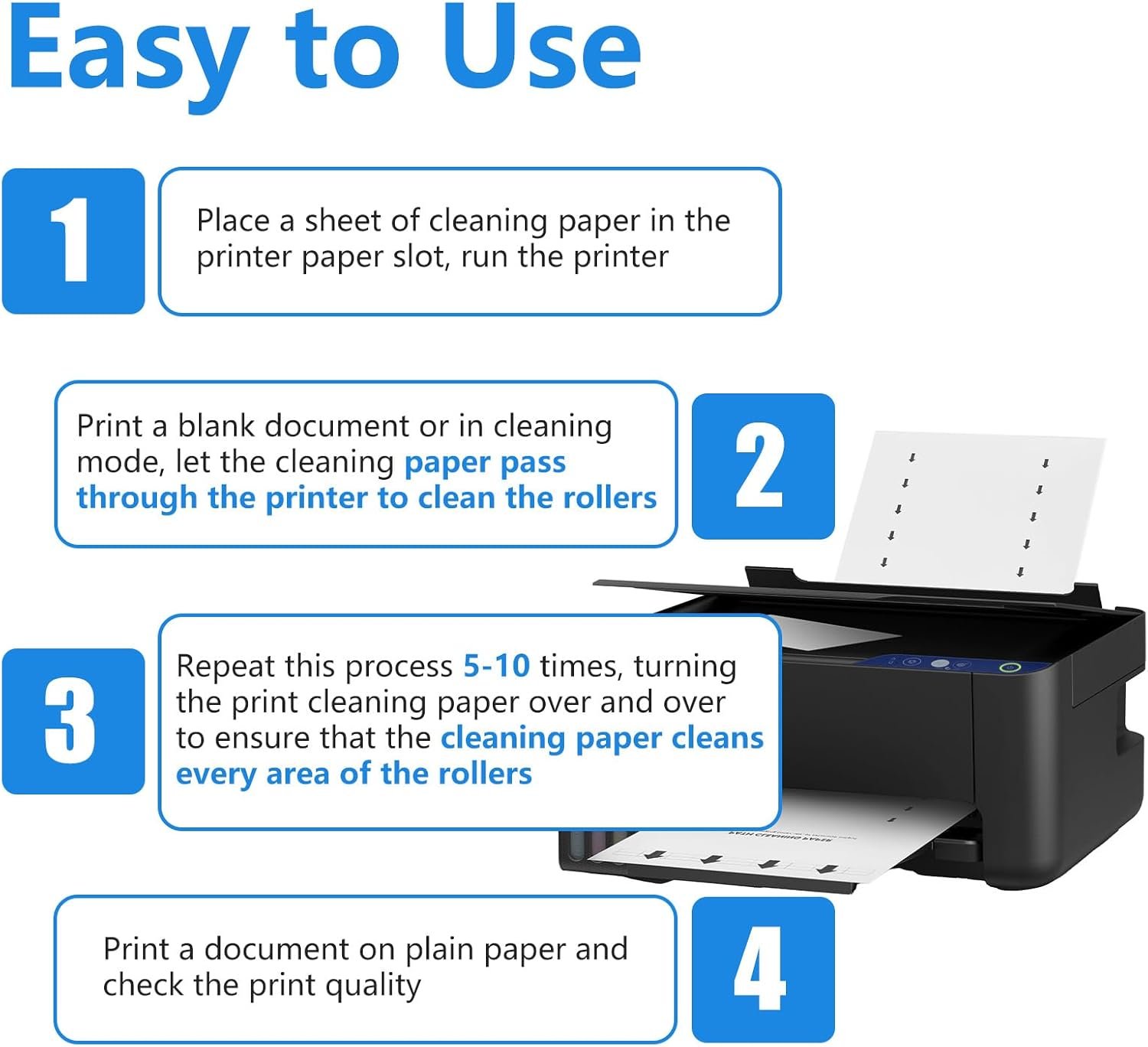 [CORRECT CHOICE]Regular cleaning of the printer rollers with laser printer cleaning paper prevents dust and powder buildup and reduces printer malfunctions. If you have any questions about the use , quality of inkjet cleaner sheets, please contact us through Amazon and we will reply to your email within 24 hours.