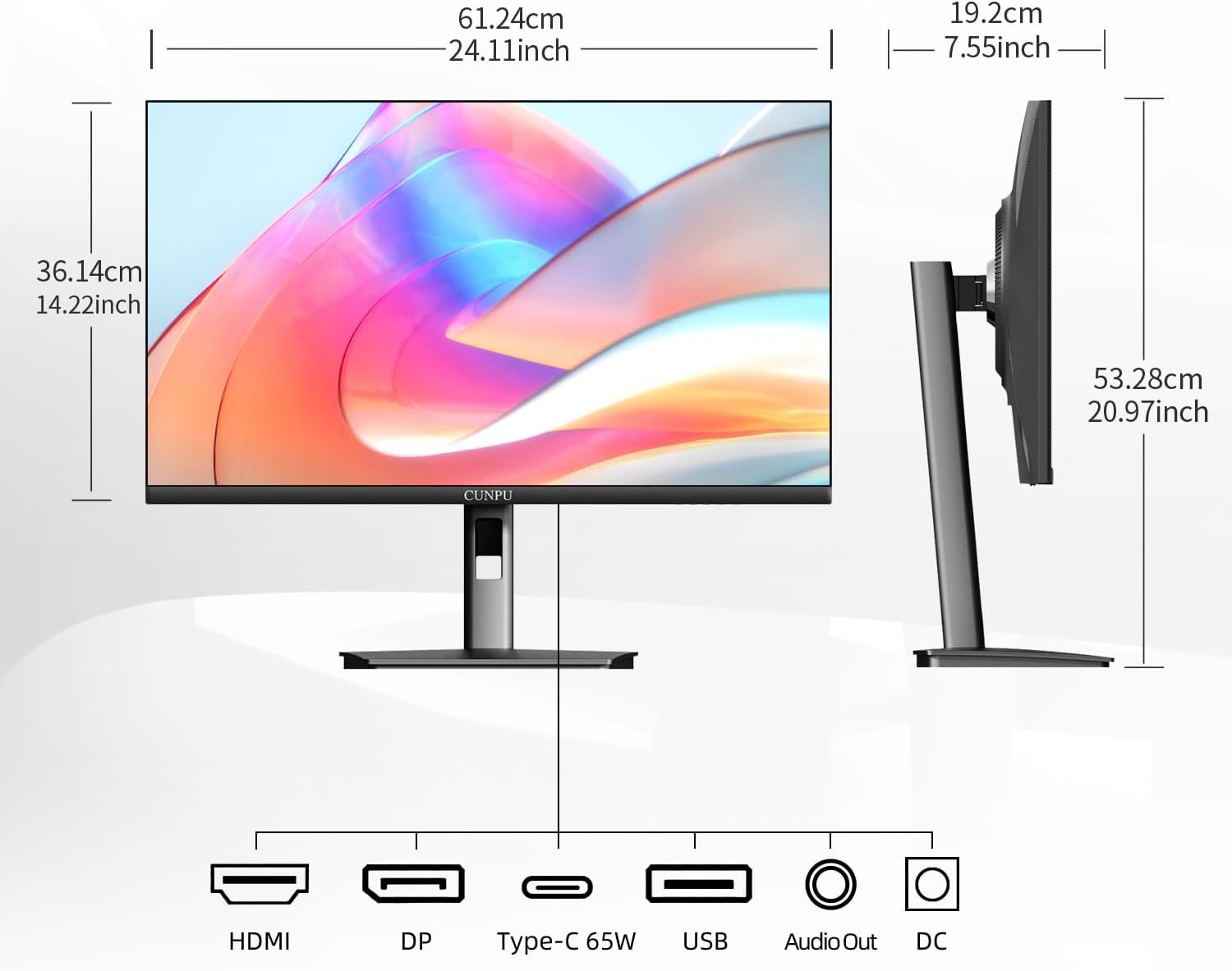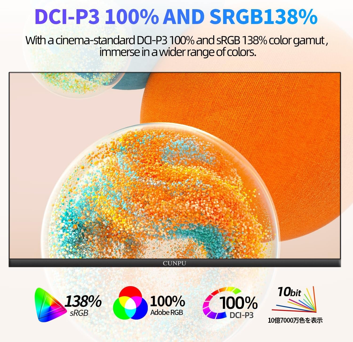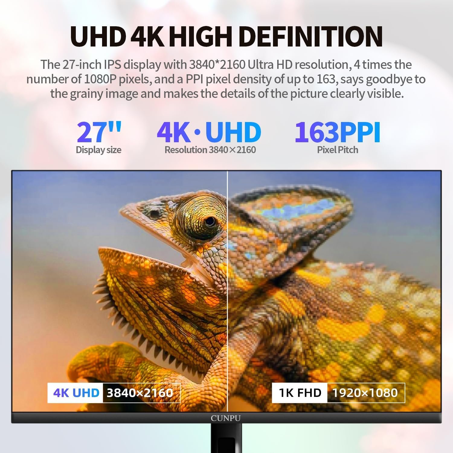 Superior 4K Image Quality: The CUNPU 4K monitor boasts a 27-inch display with four times the pixel density of Full HD (8 million pixels), providing an enhanced visual experience. With 100% DCI-P3 color coverage, it offers a rich and vibrant color spectrum. The monitor displays up to 1.07 billion colors, with a brightness of 300 nits, a 1200:1 static contrast ratio, and a pixel pitch of 163 PPI. This ensures sharp and detailed images.