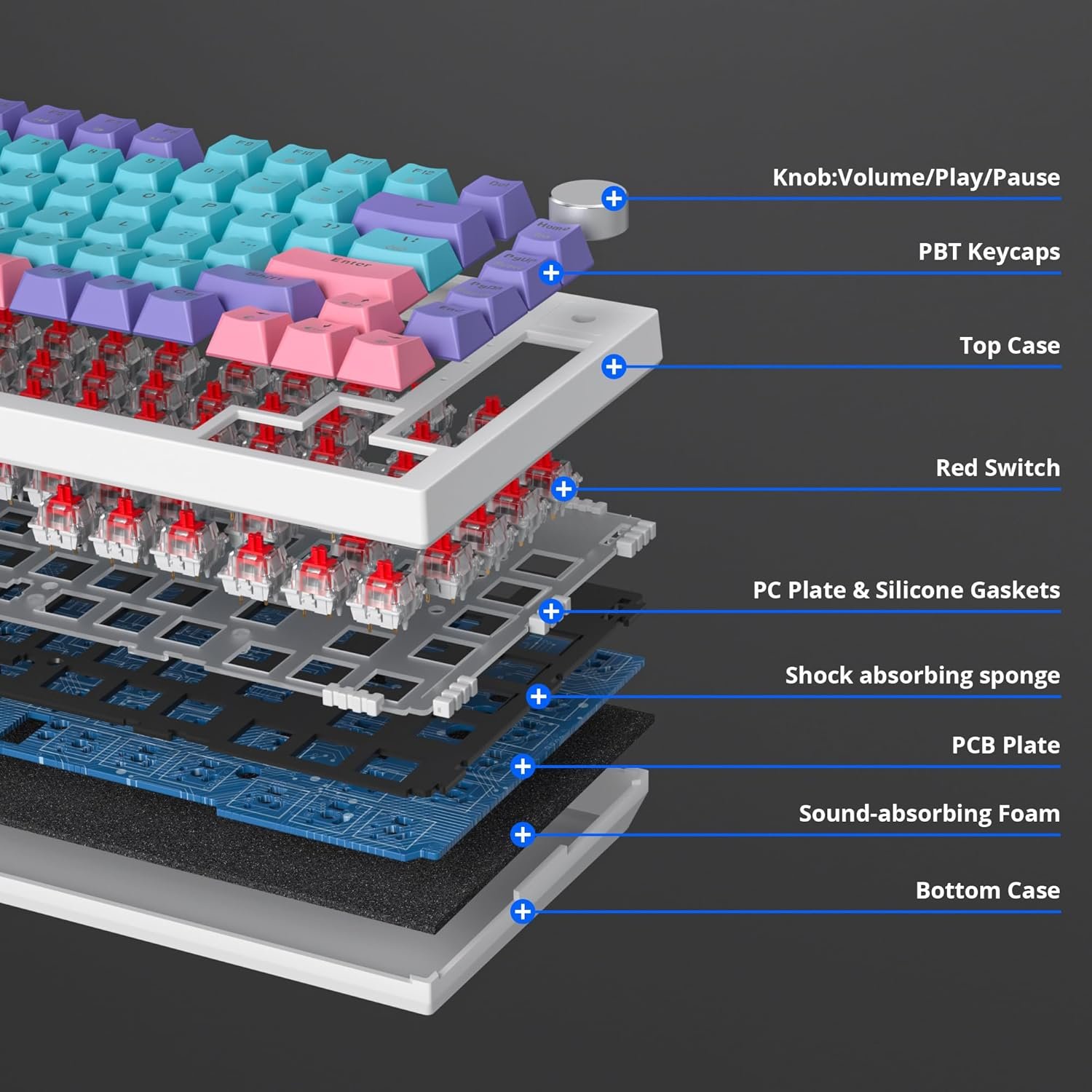 ★ Gasket Mounted Design: The gasket-mounted structure 75 percent keyboard with Sound Absorbing Pads provides a softer and quieter typing experience, -reducing noise and delivering a cushioned feel for enhanced comfort during extended use.