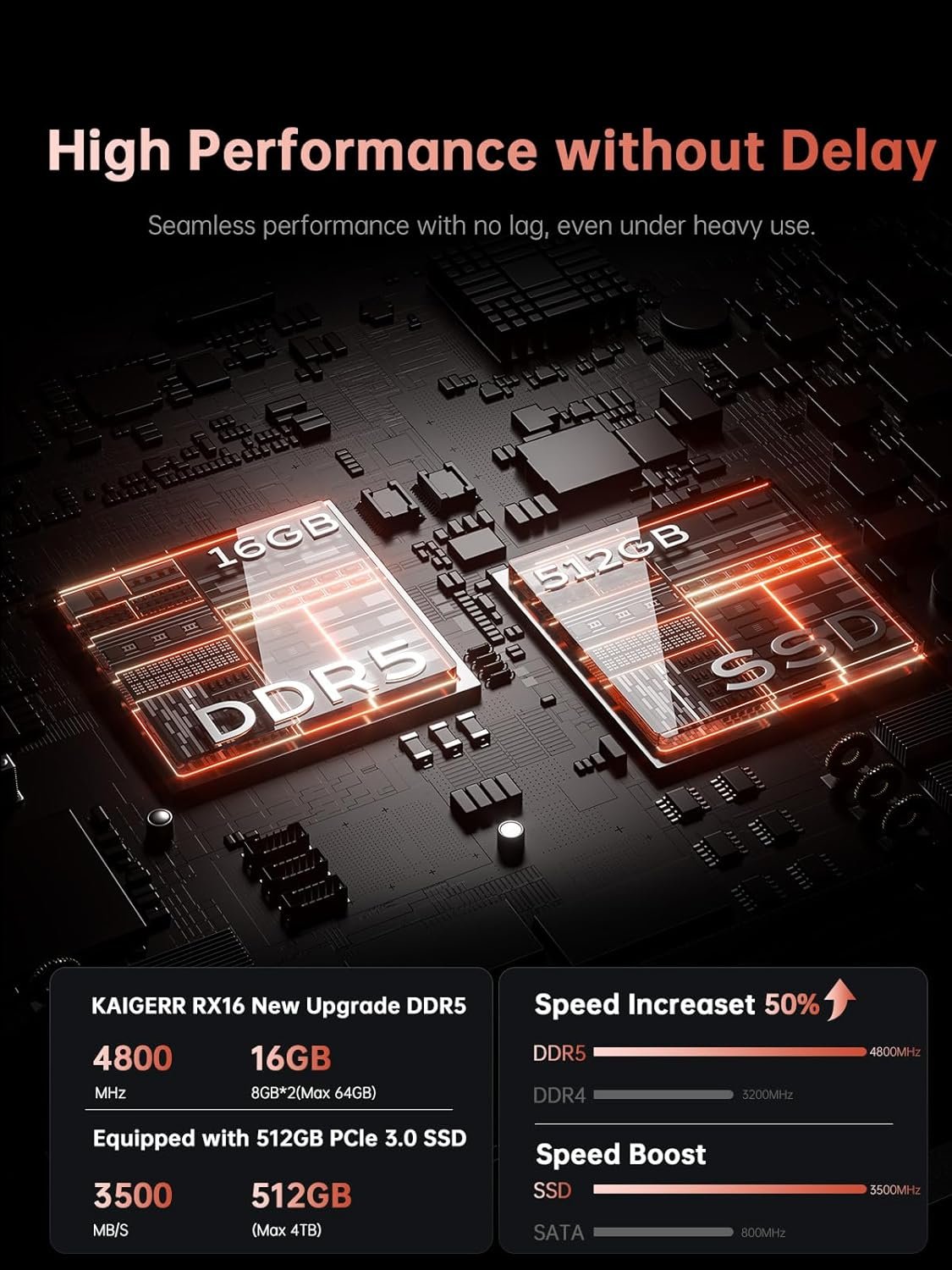 16GB + 512GB High-Speed Storage: The RX16 Ryzen 7 laptop is equipped with a high-speed DDR5 16GB ultra-large RAM that can easily handle the demands of multitasking and running large applications.The high-speed DDR5 RAM ensures a smooth and responsive system that delivers outstanding performance whether you’re working with large data sets or running memory-intensive games. In addition, the hard drive storage solution is a PCIe NVMe 512GB SSD that provides extremely high read and write speeds, significantly reducing system startup, programme loading and file transfer times. Bringing unprecedented speed and efficiency to your work and play.