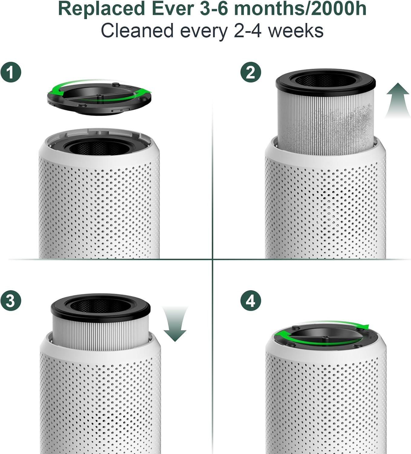 【 Filter Replacement Tips】 : Air purifiers for home pets is easy to install, with a concise user manual, with a filter replacement reminder function, when the air purifier has been running for 2000H, the filter light button will light up to remind you that you need to replace the filter, you only need to press the button for 5 seconds, and then replace the filter. Change the HEPA filter every 3-6 months depending on the environment and frequency of use, you can search ASIN: B0DKTLTFNP on Amazon to get the replacement filter you want