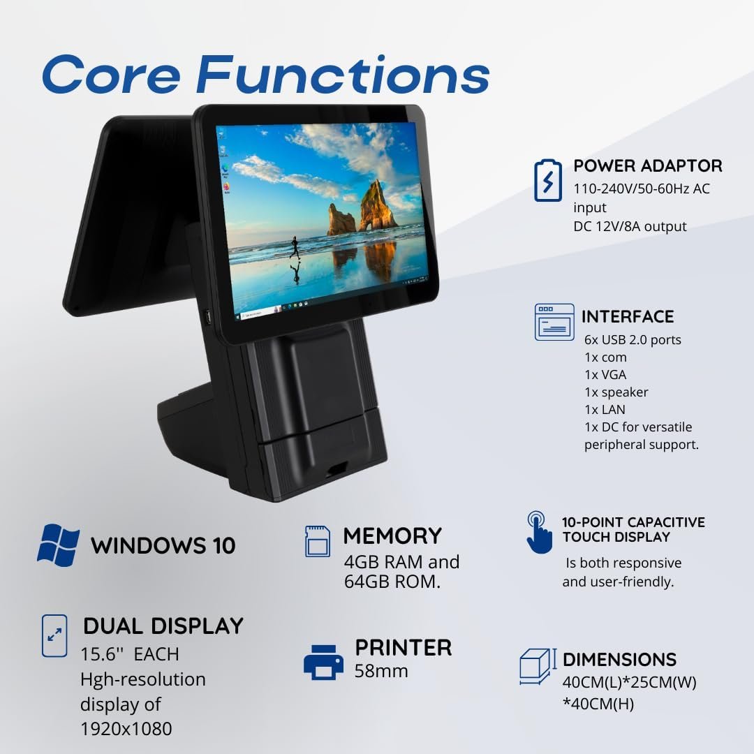 Enhance your business operations with the Windows POS System. Running on Windows 10, this state-of-the-art device boasts a powerful configuration with 4GB RAM and 64GB ROM. Featuring dual 15.6” full flat screens, a built-in 58mm printer, and a 10-point capacitive touch display, it provides an efficient and user-friendly solution for your point of sale needs.High-Performance Windows 10: Benefit from the latest Windows 10 operating system, ensuring a modern and efficient point of sale experience.