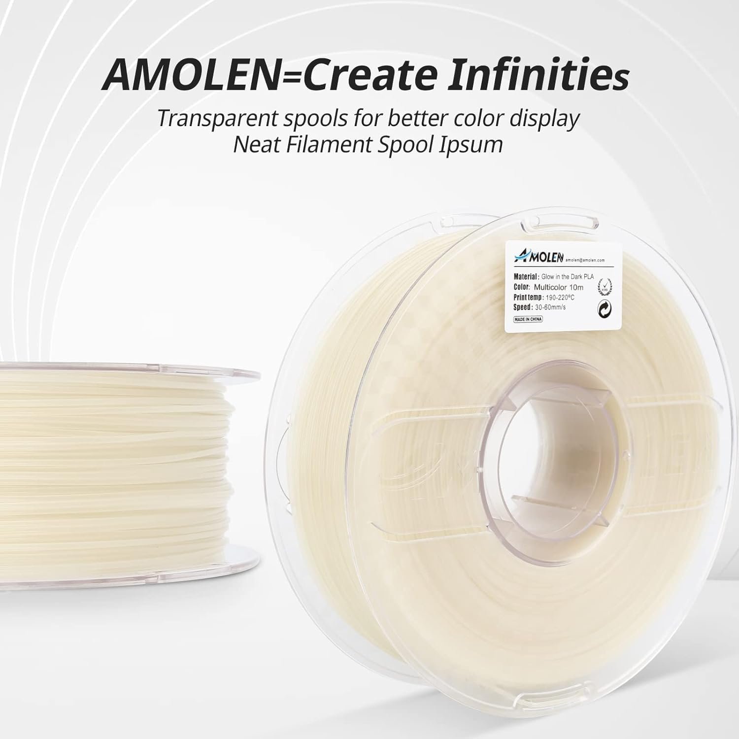 【Dynamic Color-Shifting Glow】Experience Amolen’s mesmerizing glow-in-the-dark filament, where colors transition seamlessly every 10 meters—shifting between vibrant green, blue, purple, and pink. Print longer models to reveal the full rainbow gradient effect, perfect for eye-catching nightlight designs, cosplay props, and artistic displays