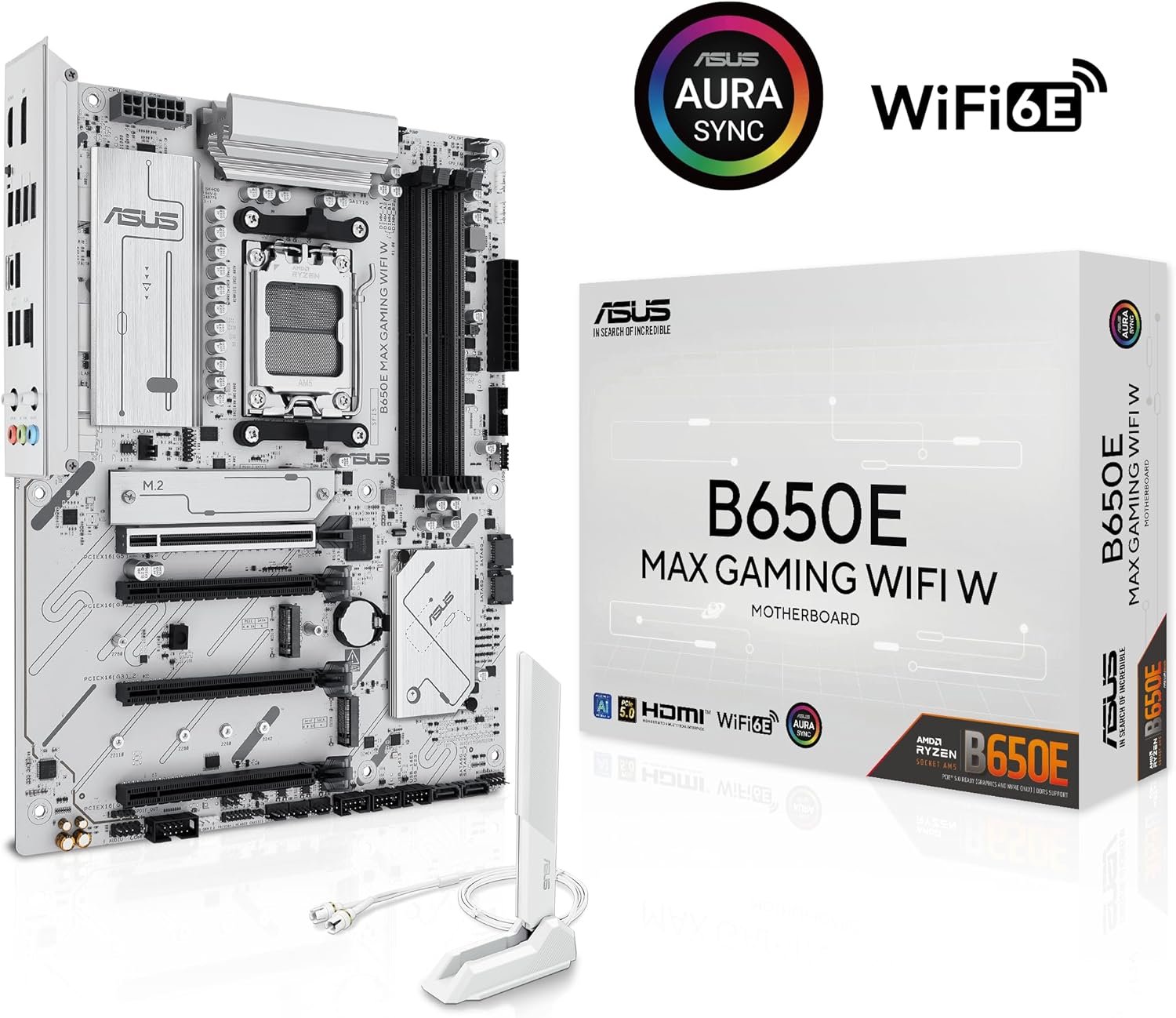 ASUS B650E MAX GAMING WIFI W features an 8+2+1 power design, 6-layer white PCB, DDR5, PCIe 5.0 x16 SafeSlot, PCIe 5.0 M.2, Wi-Fi 6E, 2.5Gb Ethernet, USB 10Gbps, BIOS FlashBack™, Addressable RGB Gen 2 headers, Aura Sync, Q-LED Core, Fan Xpert 2+, Q-Antenna, AEMP, and ASUS 5X PROTECTION III.