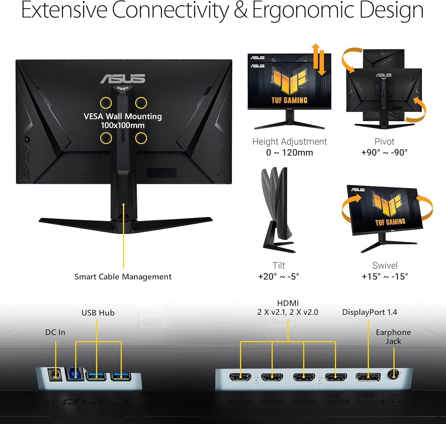The 28-inch TUF Gaming VG28UQL1A 4K UHD gaming monitor features a Fast IPS panel and NVIDIA® G-SYNC® compatibility for blistering-fast 144Hz gaming. Equipped with two HDMI 2.1 ports, console gamers can now game at 120Hz refresh rate with 4K visuals and 90% DCI-P3 gamut for exceptional colors and contrast.