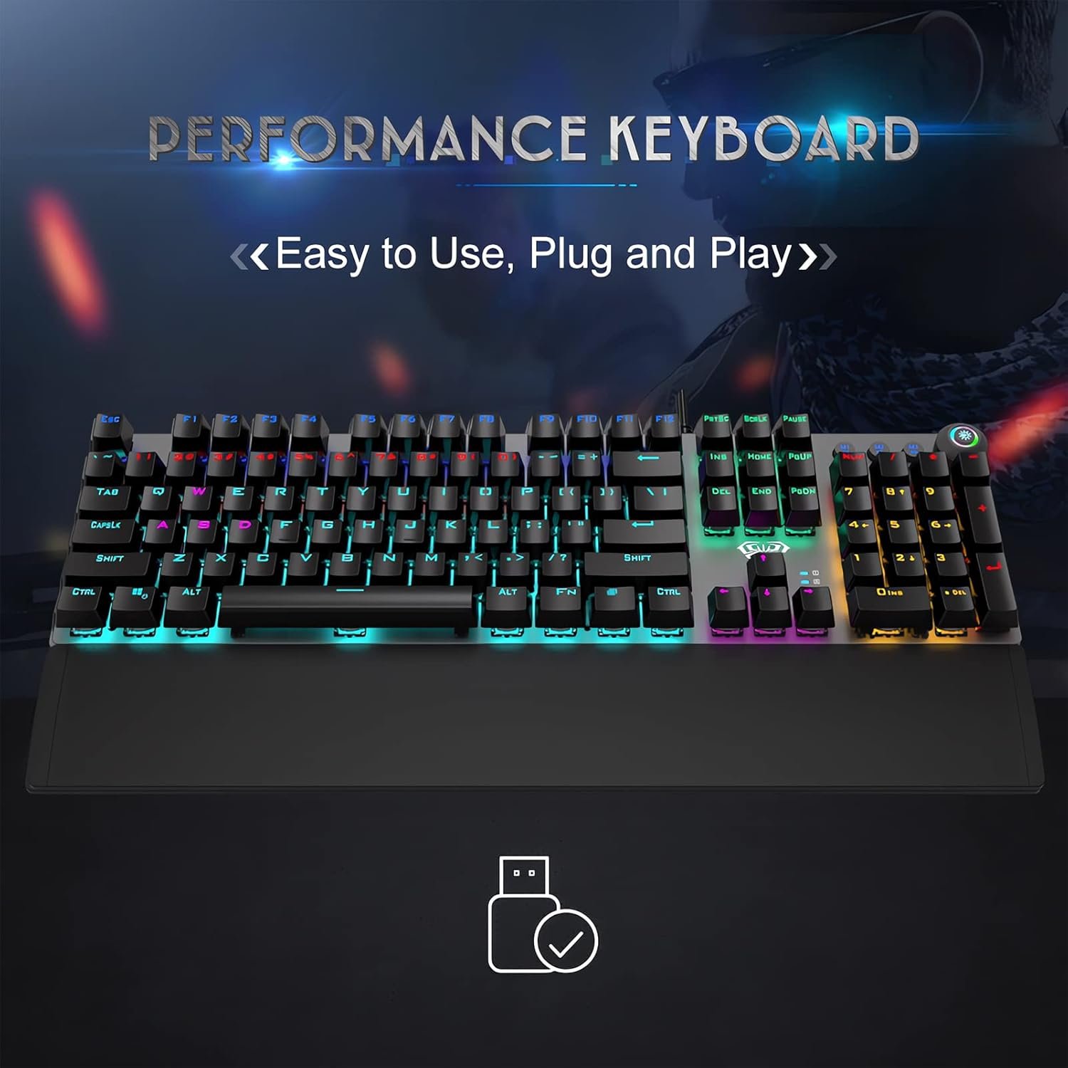 Blue Switch and Widely Compatibility: Adopt more professional mechanical shaft, the blue switch gaming keyboard designed to offering the satisfying tactile typing experience, deliver accurate, responsive key commands for typing and gaming. USB wired connect, plug and play, no driver required. Suitable for Mac OS, Windows 7/8/10/XP/VISTA.Very suitable for PC gamers, typists, cashiers, writer, programmer, teacher, students