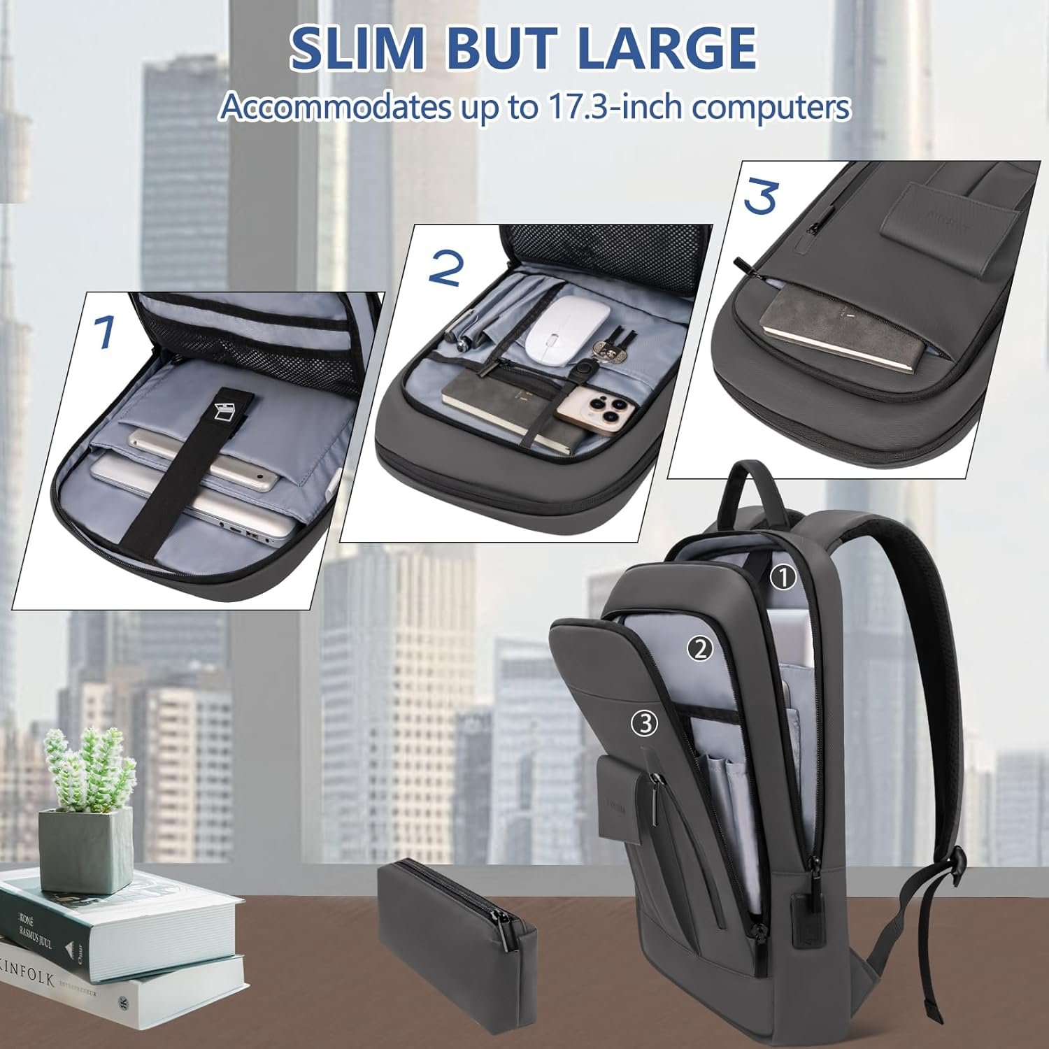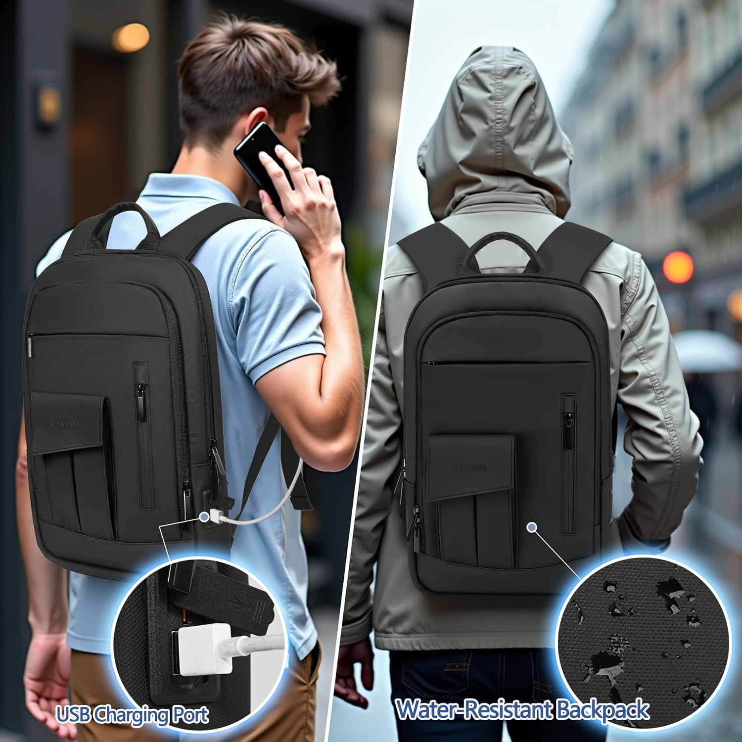 【Perfect Size】The size of the laptop backpack is 17.7*13*4in,and ONLY 1.8lb.(This lightweight business backpack is only for 17.3 inch laptop, Please check the SIZE before purchasing).This slim backpack also comes with an additional 8.8*3.7*1.5inch pouch.Lixiin waterproof backpack is suitable for work,commuting,traveling.This trael backpack is a gift for men/women!