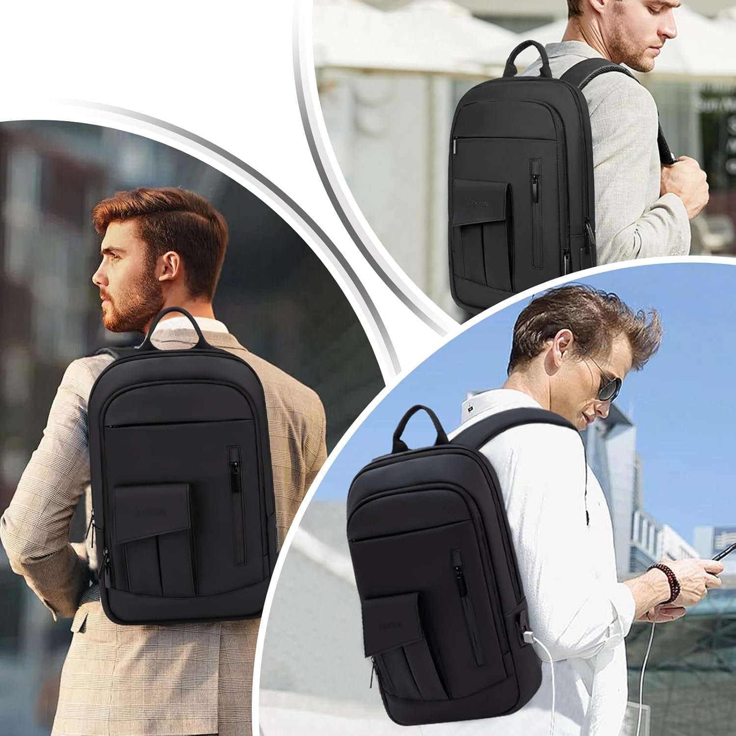 【Fashion Design】Meticulously designed by our team, this slim men’s backpack is truly one-of-a-kind.①. In the front of the waterproof backpack there is a unique pouch designed for storing your data cable car keys headphones etc.②. This anti-theft backpack features a unique hidden zipper design on the surface to protect your valuables.③. The main compartment and the second compartment have multiple multi-functional pockets designed exclusively for storing small items.