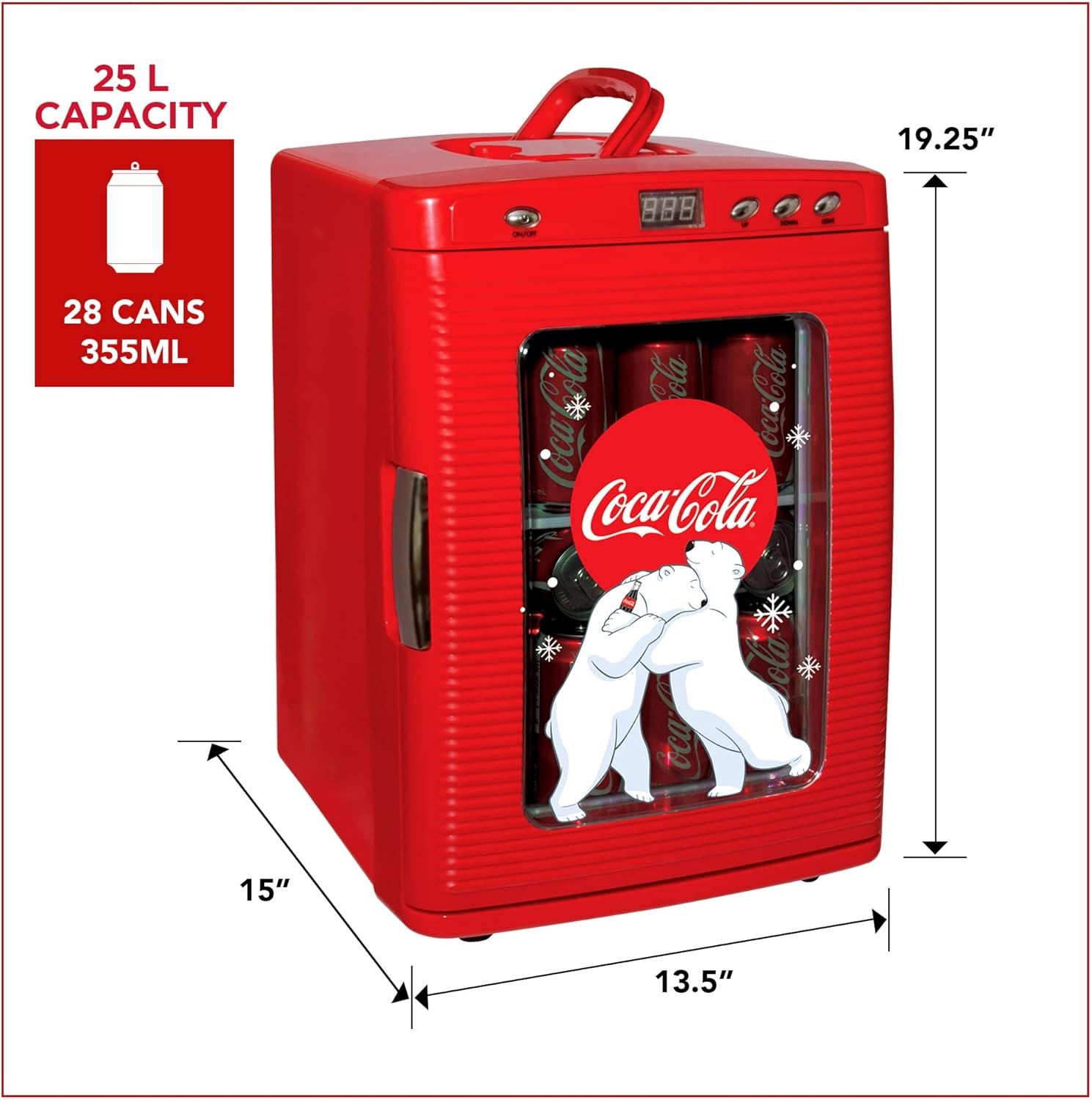 Celebrate your favorite beverage with iconic Coca-Cola graphics! Do you remember when you first saw the Coke polar bears? Their first TV appearance was a holiday-themed ad in 1993, but they have actually been used in print ads since 1922. These cuddly bears have been featured annually since their TV debut and even scored their own Super Bowl spot! With eye-catching artwork, vibrant red finish, and sleek chrome accents, this unique mini fridge is a must-have for fans and collectors. A glass door features the iconic holiday design while still showcasing the beverages inside and digital temperature control, interior lighting, and removable shelf allows for further customization. Efficient, reliable thermoelectric cooling and warming technology makes this 25L (26 qt) mini fridge/warmer the perfect accessory for your home bar, office, or dorm room. It is AC and DC capable and comes with both cords so you can plug it into any standard household outlet or use it in your car, boat or RV.