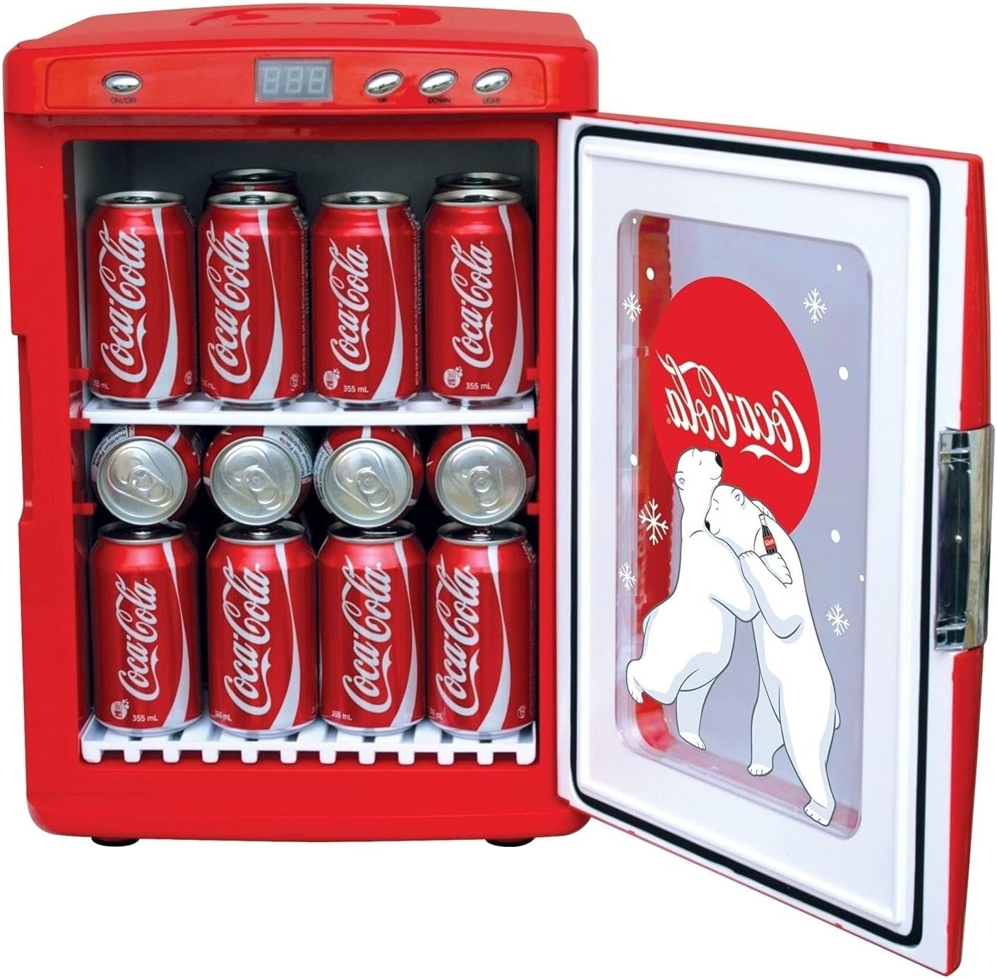 Iconic Coca-Cola Polar Bear Design: Celebrate 100 years of Coca-Cola’s charming polar bear artwork with this vibrant red mini fridge. Perfect for fans and collectors, this striking piece adds a festive touch to any room, making it a must-have for your bedroom or personal space.