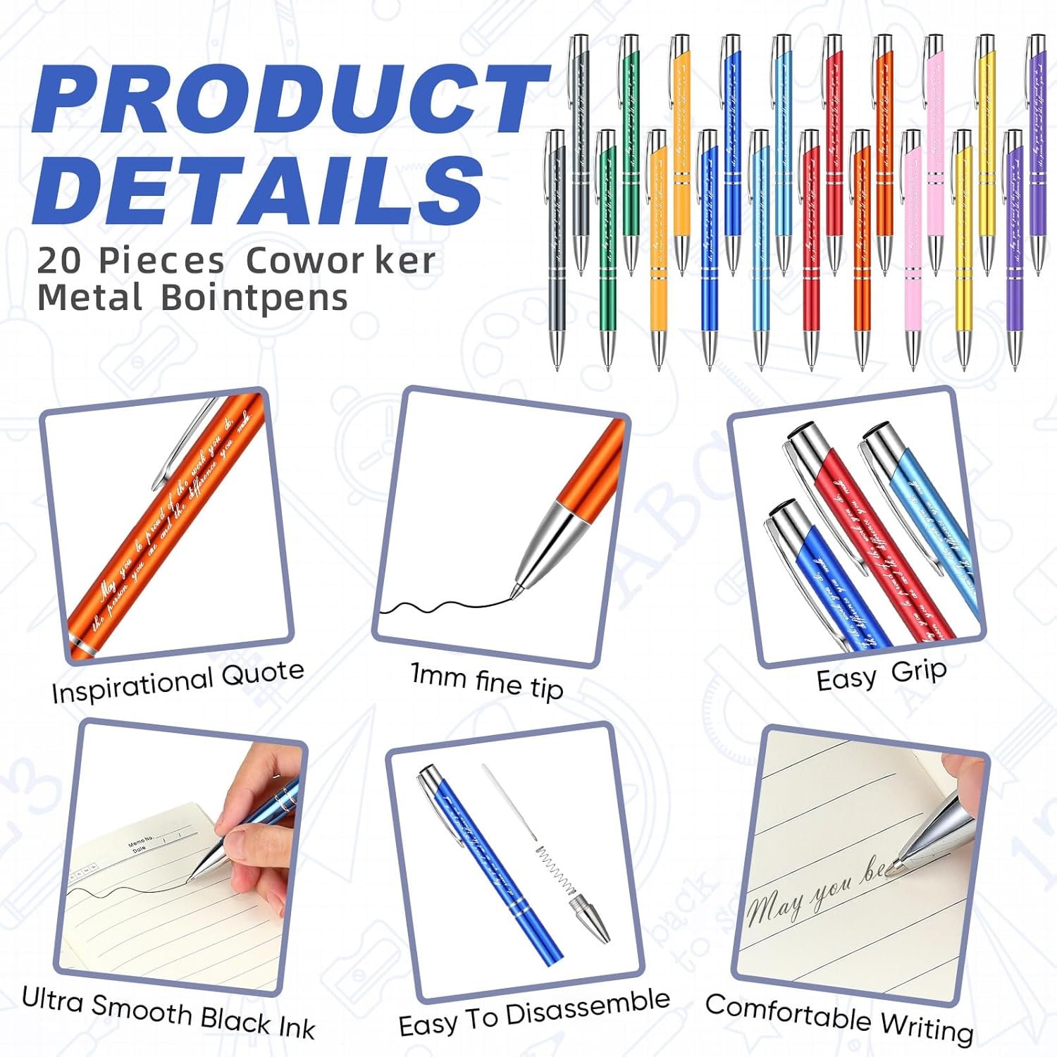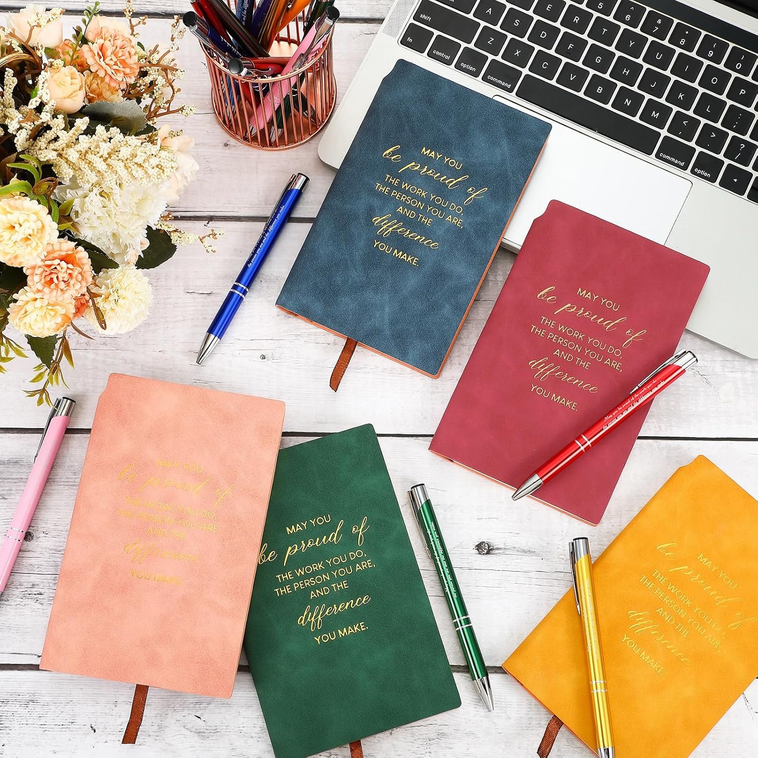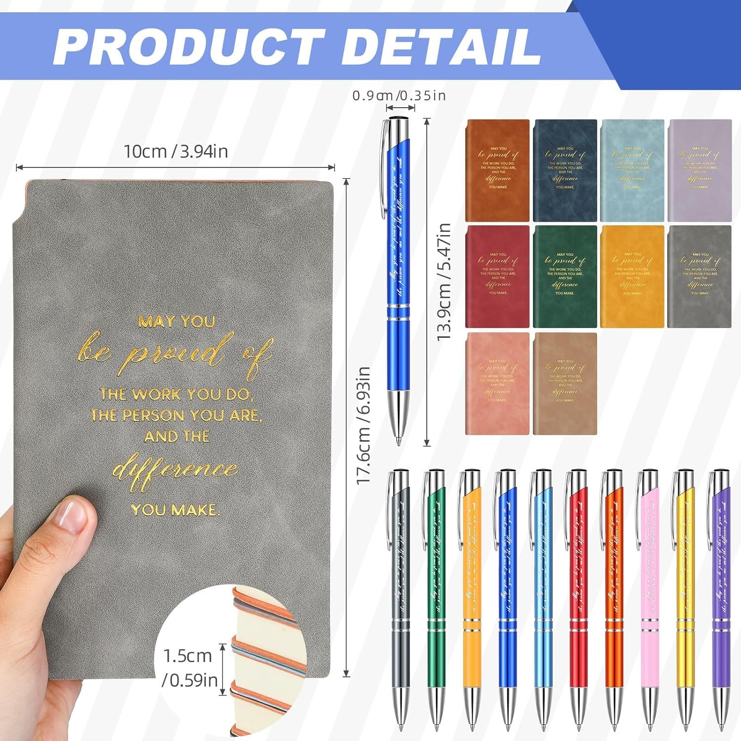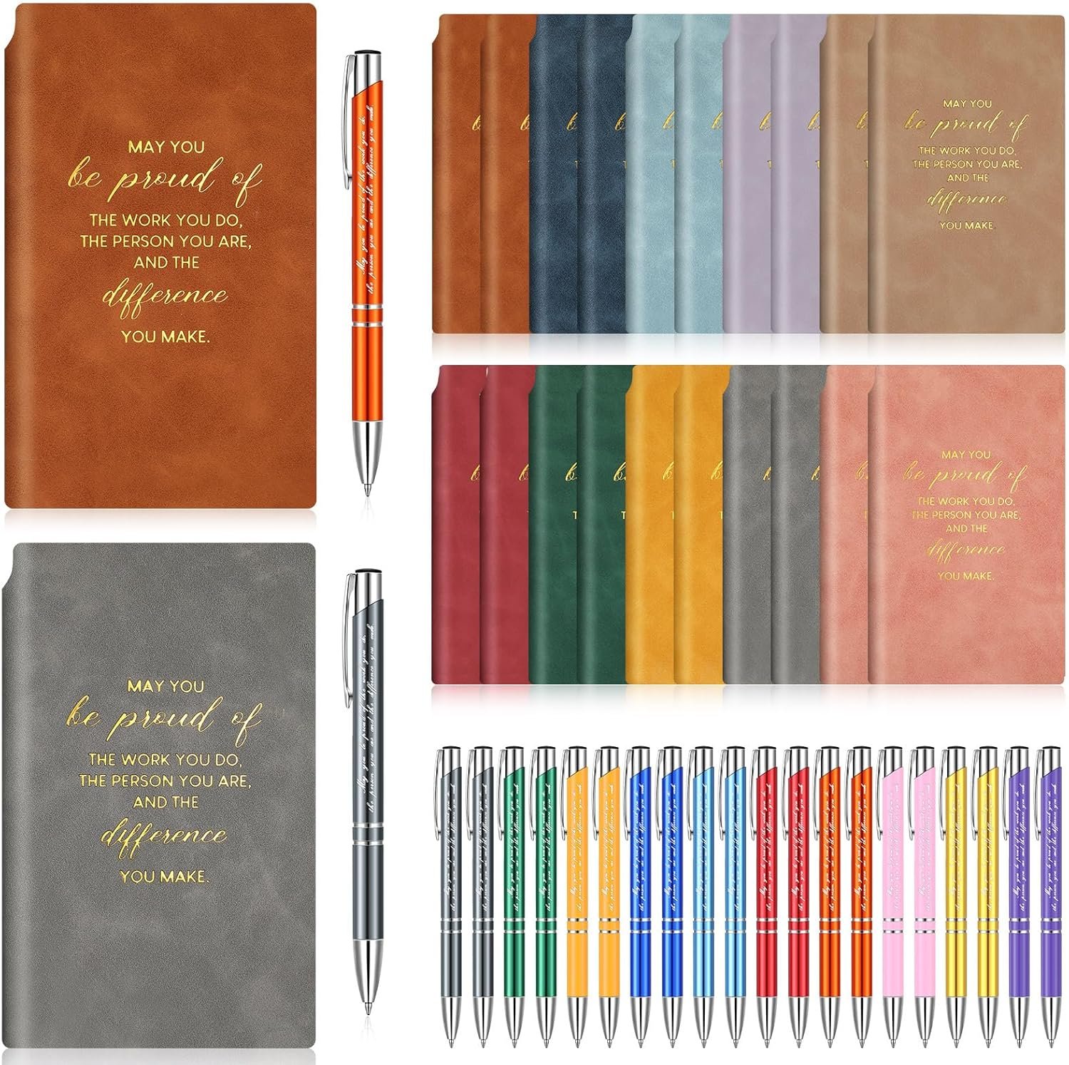 Inspirational Design: these inspirational pens and appreciation leather journals have inspirational texts that are meaningful and positive, which can easily bring you a good mood and help develop a positive attitude; The pens and notebooks are printed with motivational text [May you be proud of the work you do, the person you are, and the difference you make], which can inspire your colleagues, employees, friends, and teachers to be positive
