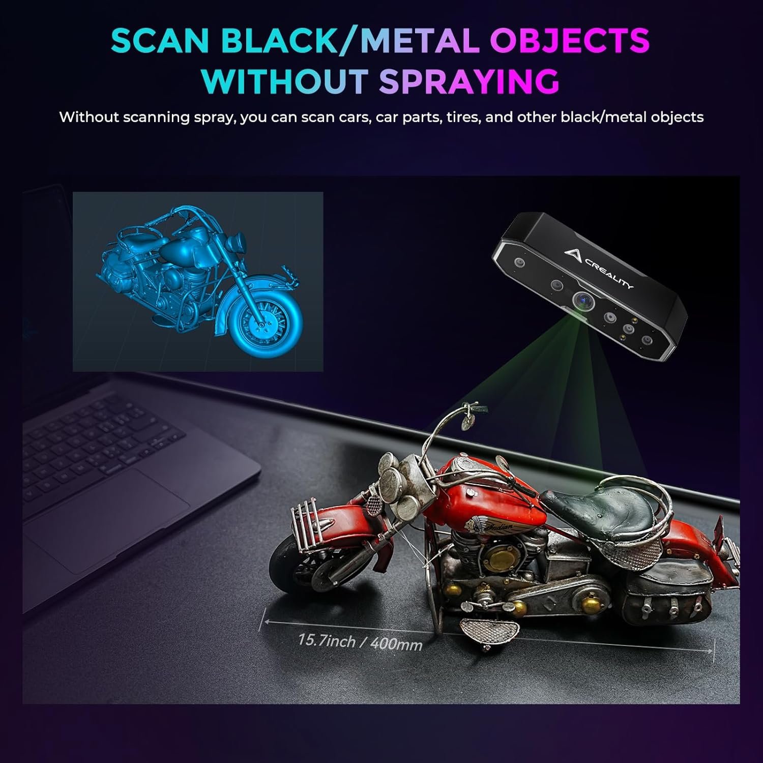 Technology Upgrade: This scanner can easily scan black/metal objects such as cars, car parts and tires without scanning spray. Face & Body Mode is equipped with a unique facial mapping algorithm to capture more details and easily scan hair. It only takes 2 minutes to scan a human body.