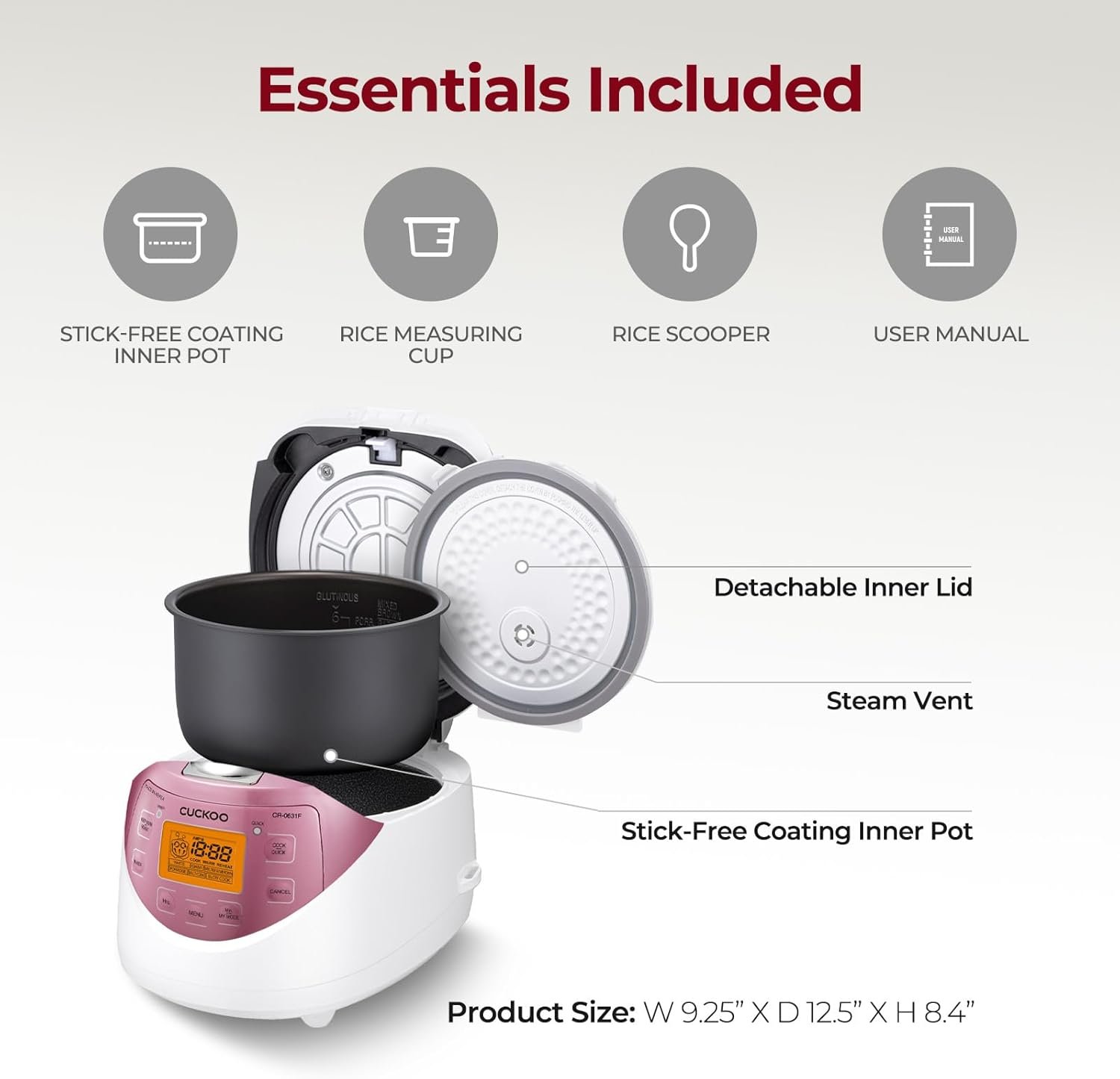 Embark on a Culinary Adventure with CUCKOO’s CR-0631F 6-Cup Micom Rice Cooker! With a generous serving amount of 12-cup cooked capacity and simple controls, CUCKOO’s 6-Cup Micom Rice cooker is ideal for large families and those looking to elevate their cooking experience. Key Features: Multi-Functional Cooking: 7 menu options including white (glutinous) rice, mixed rice, baby food, soup, and even a Turbo Mode that brings fresh white rice under 35 minutes bring cooking ideas to life. 12-Cup Cooked Capacity: The 6-cup (12 cups cooked) rice cooker offers the ideal serving size for small gatherings or small to medium-sized families. Smart Automated Technology: The included My Mode and Fuzzy Logic Technology automatically detects the grain type and customizes the desired texture and flavor of your cooked rice and grains. High-Quality Construction: The durable nonstick inner pot and user-friendly digital touch controls ensure easy usage and to last through consistent use. Hassle-Free Cleaning: With a detachable inner lid, cleaning is made effortless to ensure quality rice after each use. Don’t wait and grab CUCKOO’s 6-Cup Micom Rice Cooker to bring your culinary dreams to life!