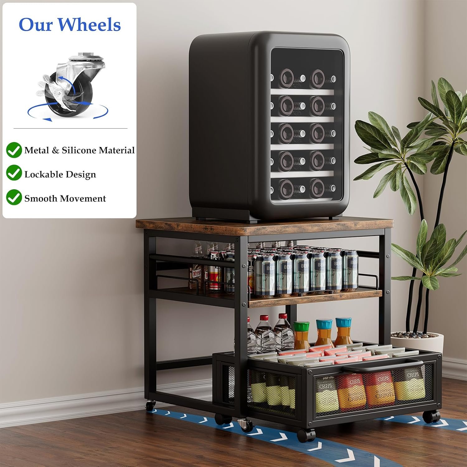 Premium Metal Wheels with Locking Design: Equipped with durable metal wheels, this mini fridge stand offers smooth mobility. Once in place, simply engage the locking mechanism to secure the stand, ensuring it stays stable and won’t shift during use.
