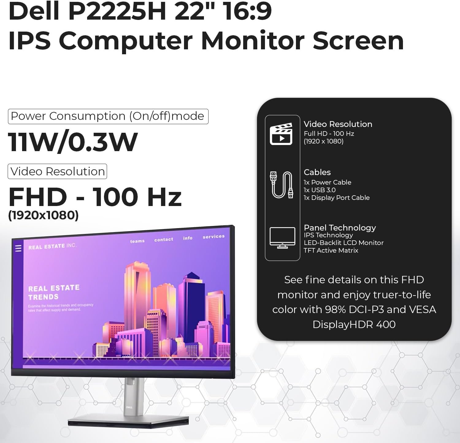 Package Includes – Dell P2225H 22″ Monitor, 1x Power Cable, 1x USB 3.0 Upstream Cable, 1x Display Port Cable, 1x HDMI Cable + Microfiber Cloth Included