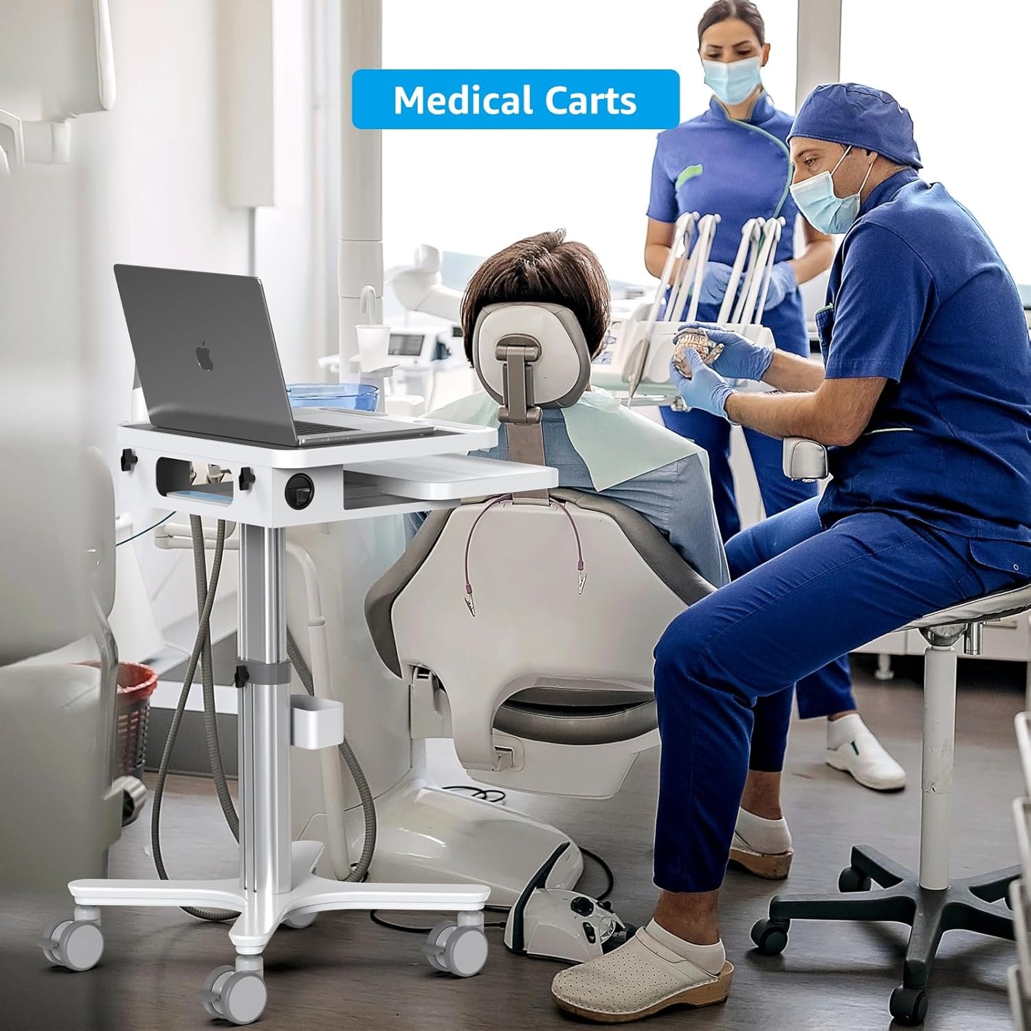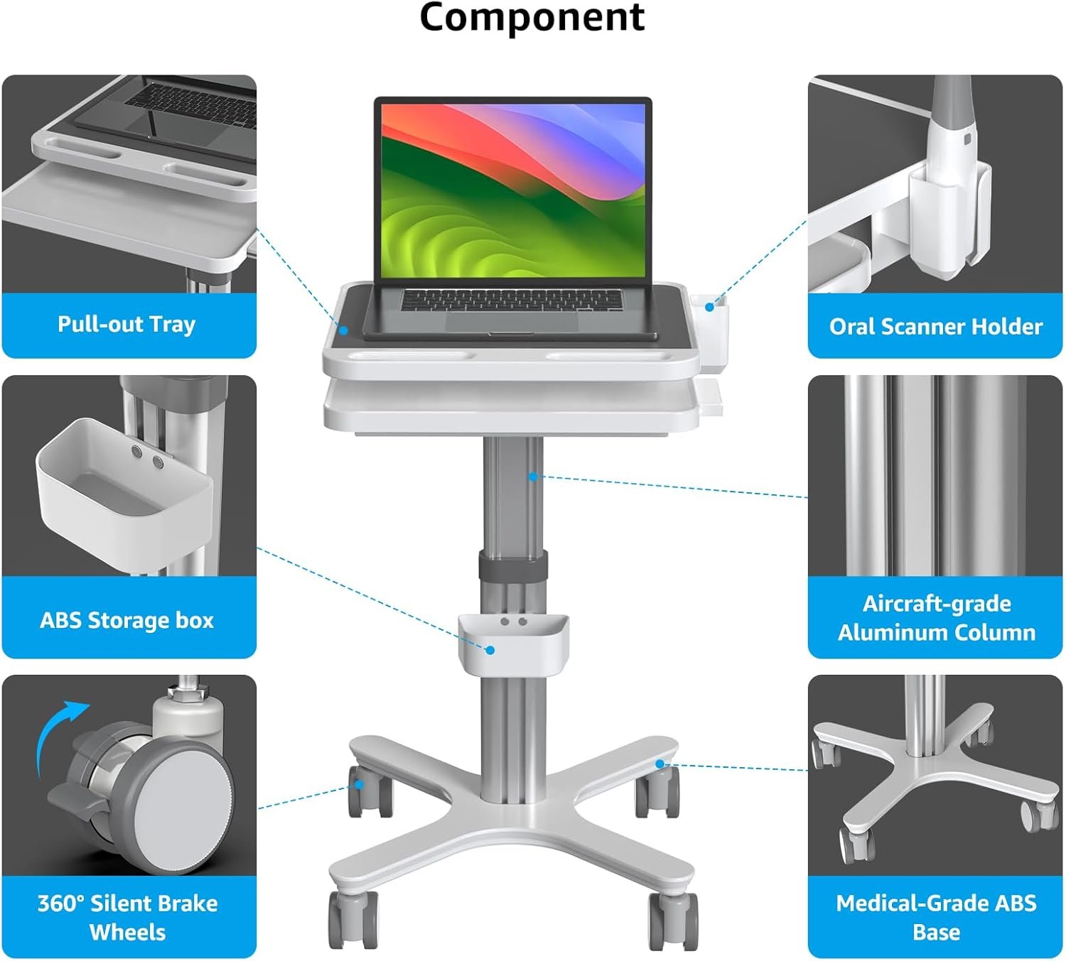 【PACKAGE INCLUDE】The medical cart has 1 large tabletop,1 oral scanner holder,1 keyboard holder,1 storage box,1 built-in plug outlet,and the height of the cart is manual adjustment