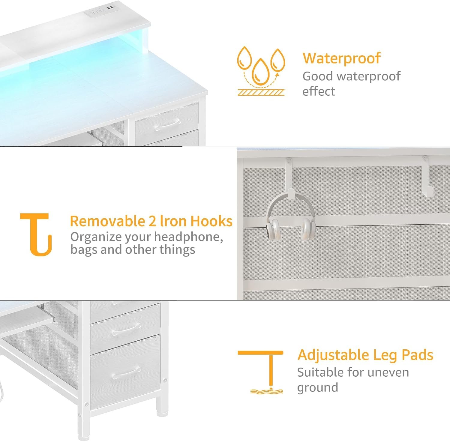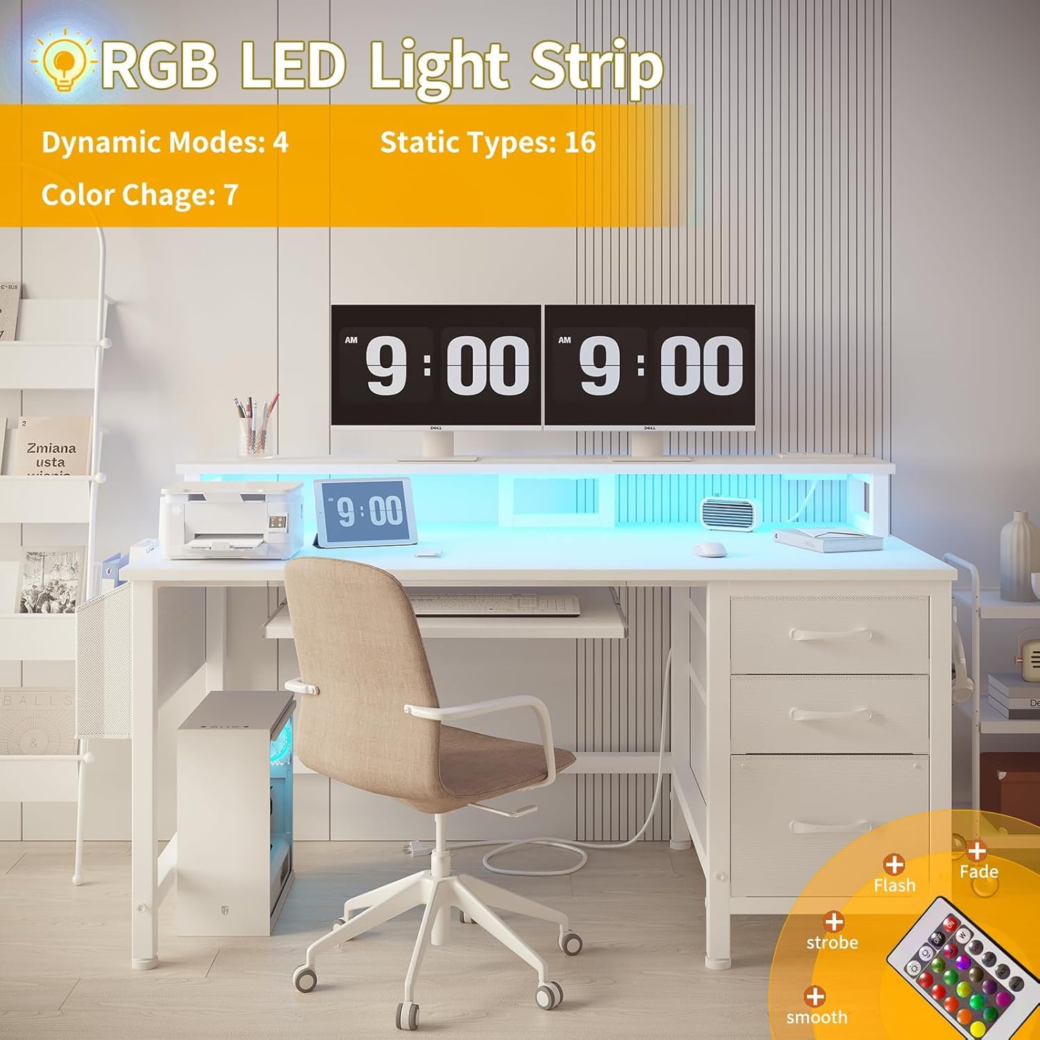 DLisiting White Computer Desk with File Drawers Cabinet, 47 Inch Home Office Desks with Keyboard Tray, Gaming Desk with LED Light and Power Outlet, Writing Table PC Desks with Monitor Stand, White