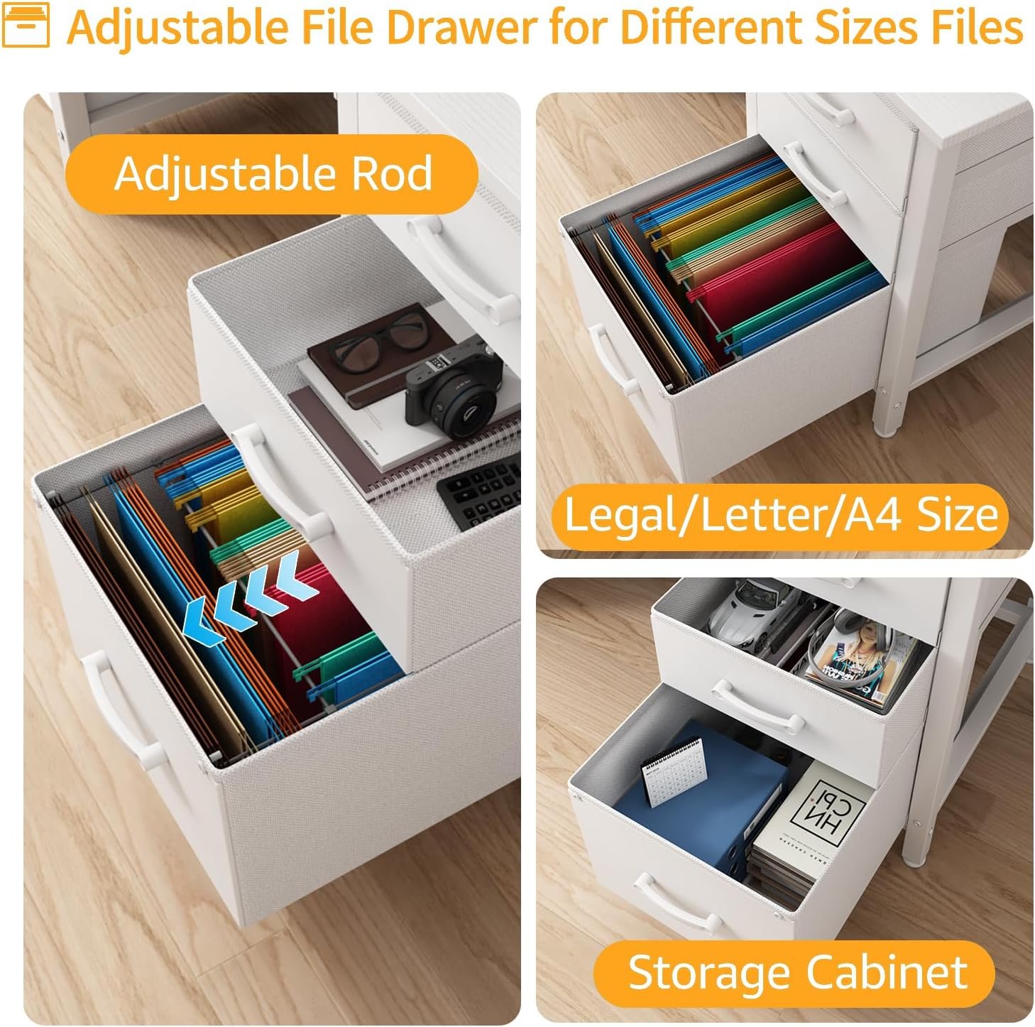 Multi-functional File Cabinet and Drawers: This computer desk features 3 fabric drawers, making it lightweight and easy to move. The versatile file cabinet keeps all your essentials organized and within reach. The adjustable file drawer accommodates both legal and letter-sized files, while the two small drawers provide additional storage for home office supplies