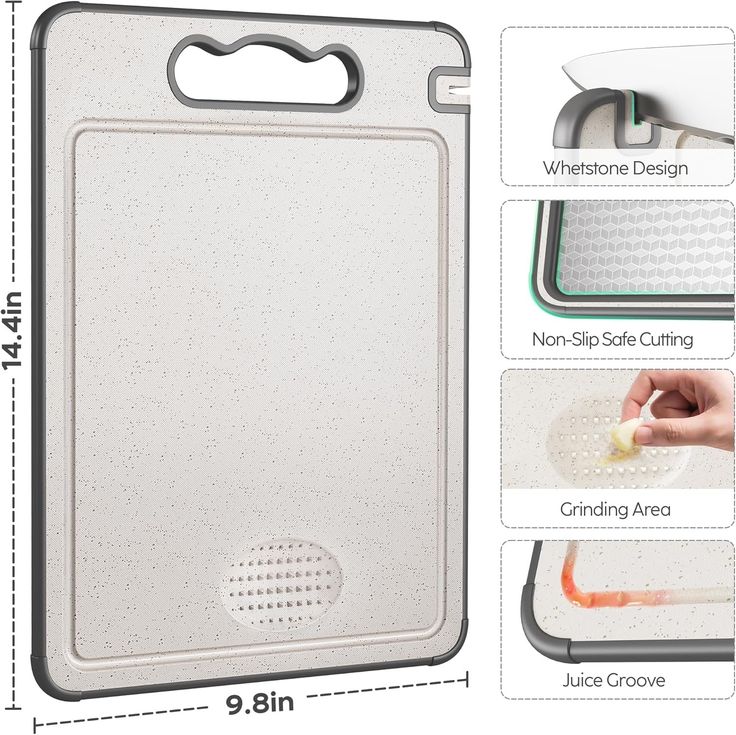 [Thoughtful Design]:This cutting board is equipped with a non-slip silicone edge, which can stabilize the cutting board during cutting to prevent sliding and reduce the risk of hand injuries. The juice groove design can effectively collect the liquid flowing out when cutting, prevent the liquid from splashing on the kitchen countertop, and keep the working area clean and tidy. Additionally, the straw side features a built-in grinding area to make handling ingredients easier.