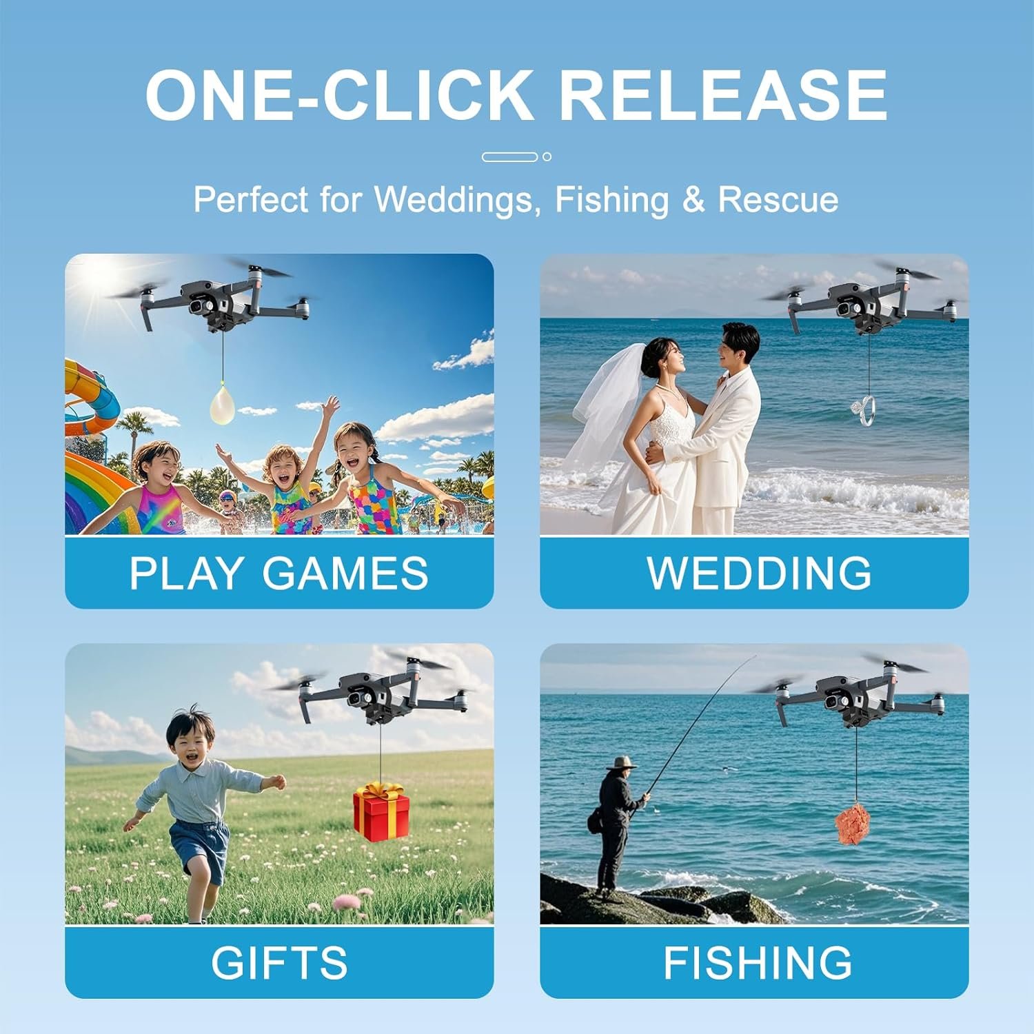 2. Heavy-Duty 750g Payload & 1KM Remote Control Drop items up to 750g (2x capacity vs basic models) with 1KM range via 2.4G remote. Perfect for delivering fishing bait, wedding rings, rescue supplies, or confetti at beach parties.