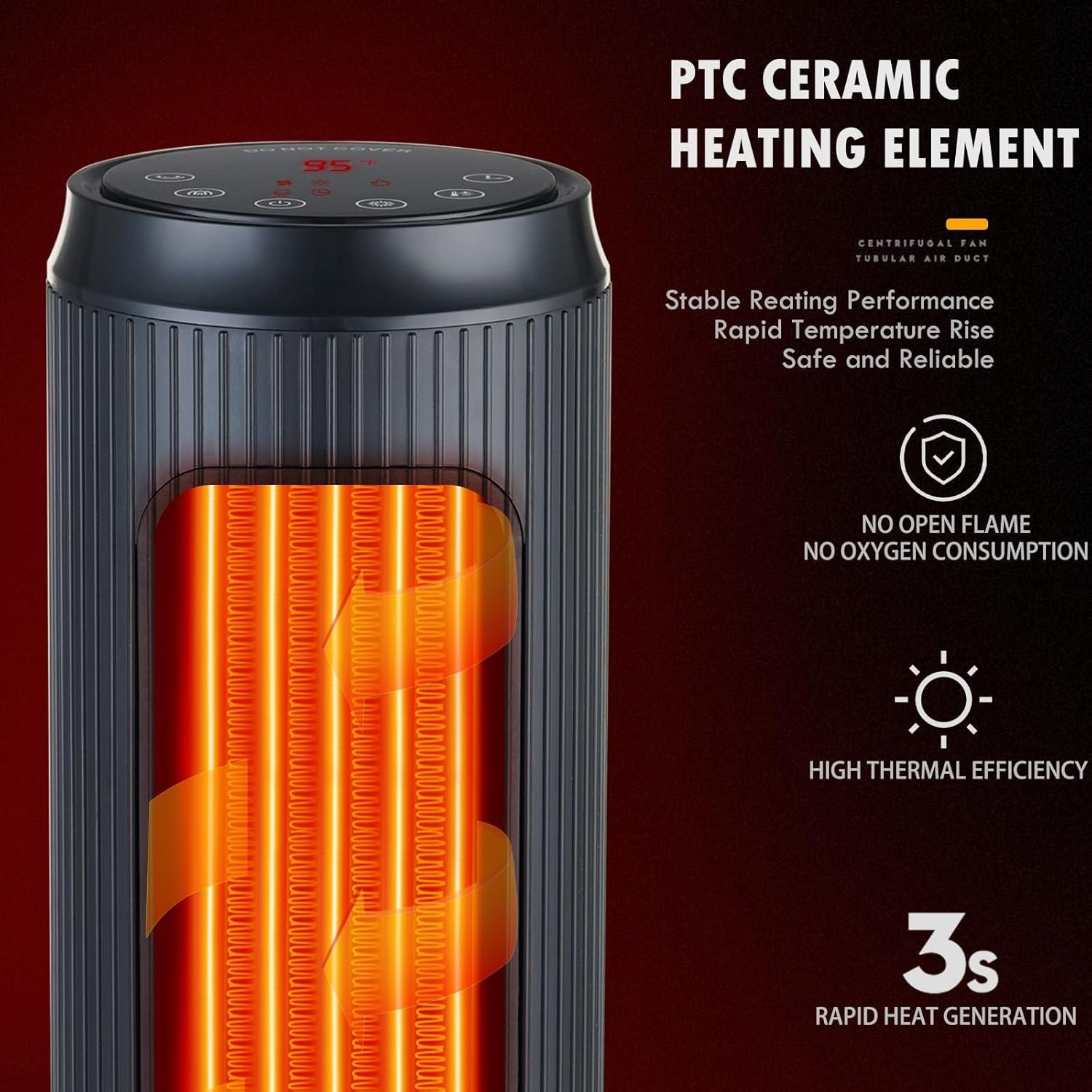 Adopting high performance fan with high airflow and low noise, it can warm up 130 sq.ft room quickly.