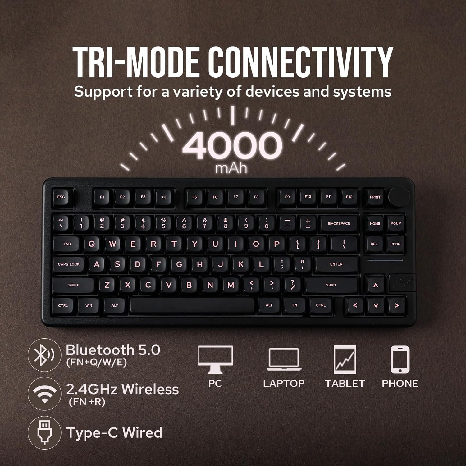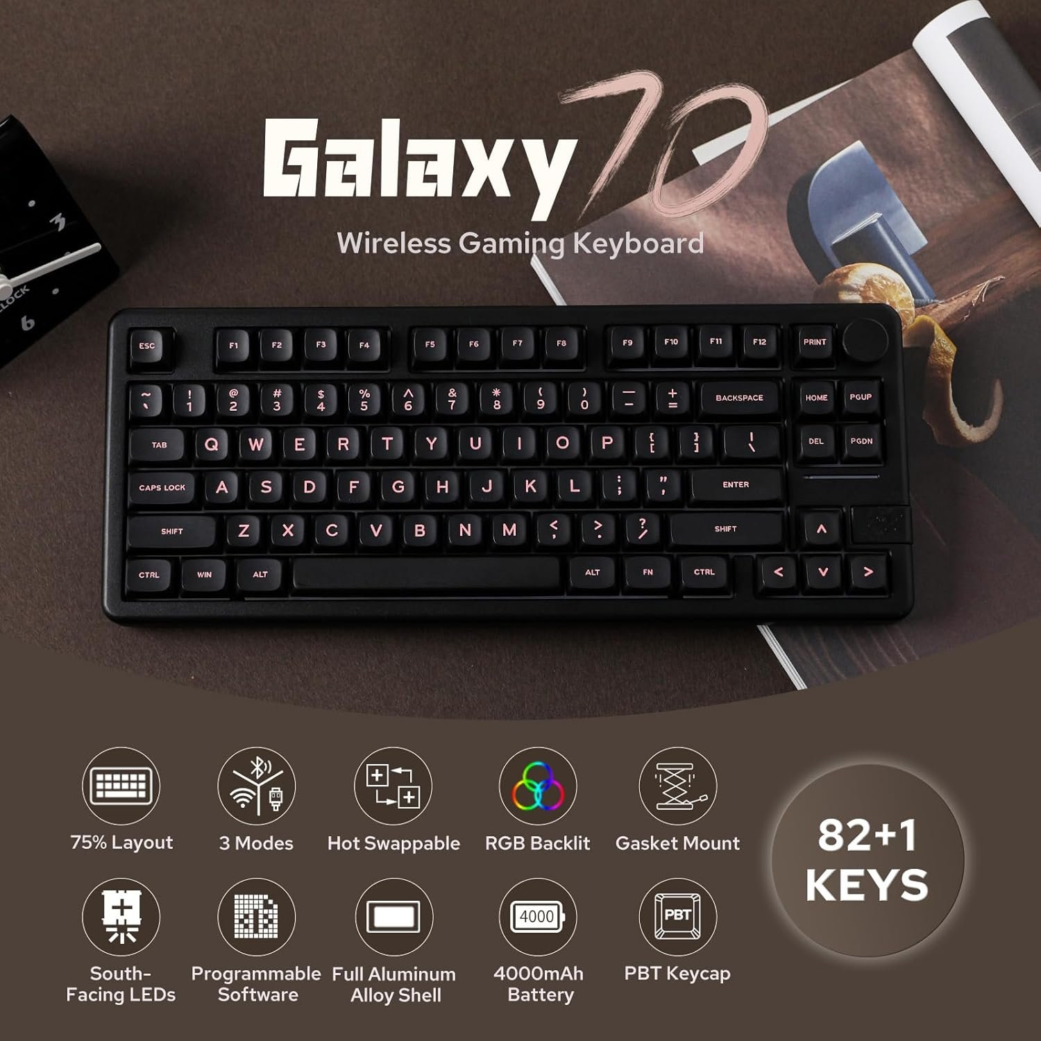 【Tri-Mode Connectivity & Long-Lasting 4000mAh Battery】The Galaxy70 wireless keyboard is engineered for versatility, offering Bluetooth, 2.4GHz wireless, and wired USB options to suit every setup. Whether you’re aiming for a sleek, wireless workspace or the reliability of a wired connection, this keyboard seamlessly meets your demands. Boosting your productivity and gaming, its 4000mAh battery ensures prolonged performance. With such substantial battery life, the Galaxy70 supports extended work sessions and gaming marathons that keep pace with your dynamic lifestyle.