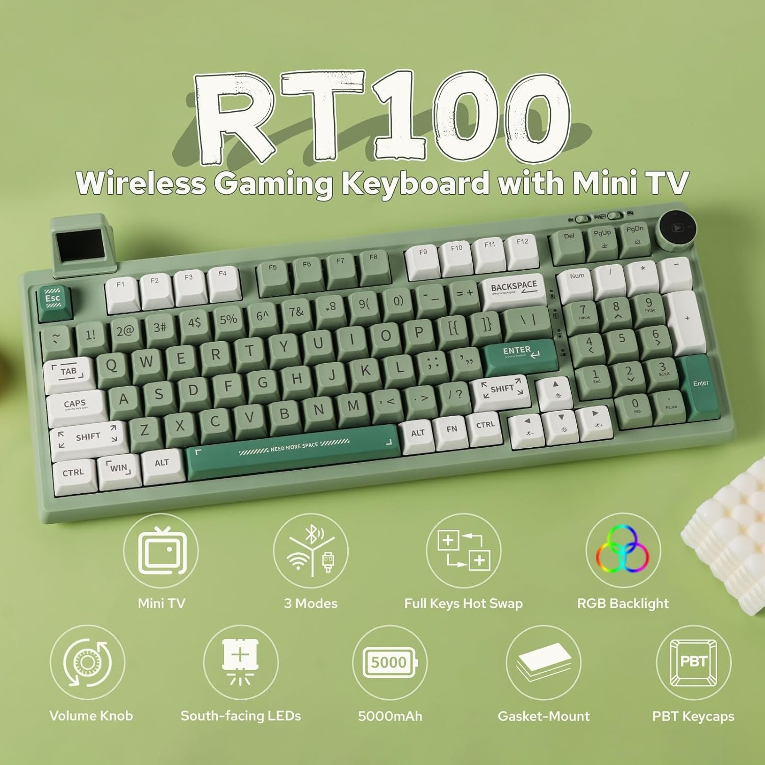 The RT100 wireless keyboard comes with an innovative and customizable smart mini TV. It can display time, date, battery level, etc. At the same time, it supports uploading GIF dynamic images through the EPOMAKER driver. In addition, the mini display screen is detachable, making the port a hidden harbor for 2.4Hz wireless receivers.