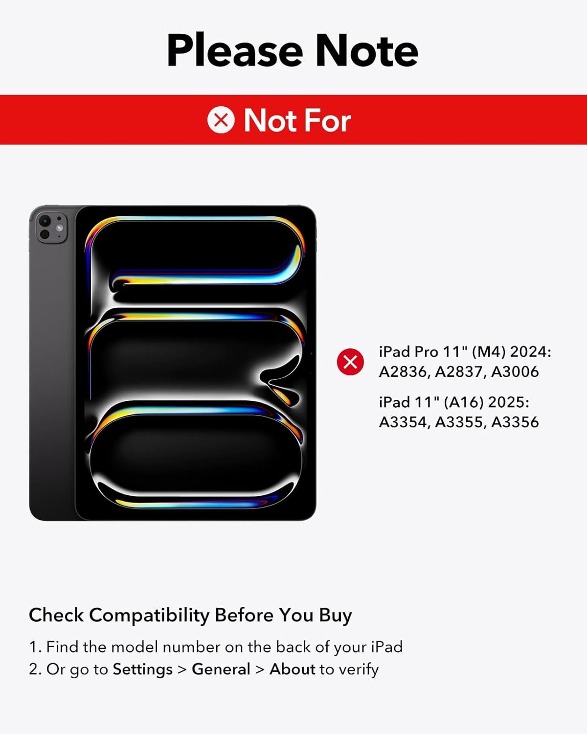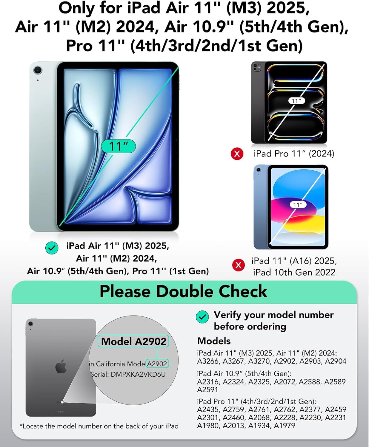 Compatibility: only compatible with iPad Air 11 inch(M3/M2 2025/2024)、 iPad Pro 11 inch (4th/3rd/2nd、 2022/2021/2020/2018)、 iPad Air 5th Generation (2022)、 and iPad Air 4th Generation (2020); models A3266、A3267、A3270、A2902、A2903、A2904、A2759、A2761、A2435、A2762、A2377、A2459、A2301、A2460、A2228、A2068、A2230、A2231、A1980、A2013、A1934、A1979、A2588、A2589、A2591、A2316、A2324、A2325、A2072