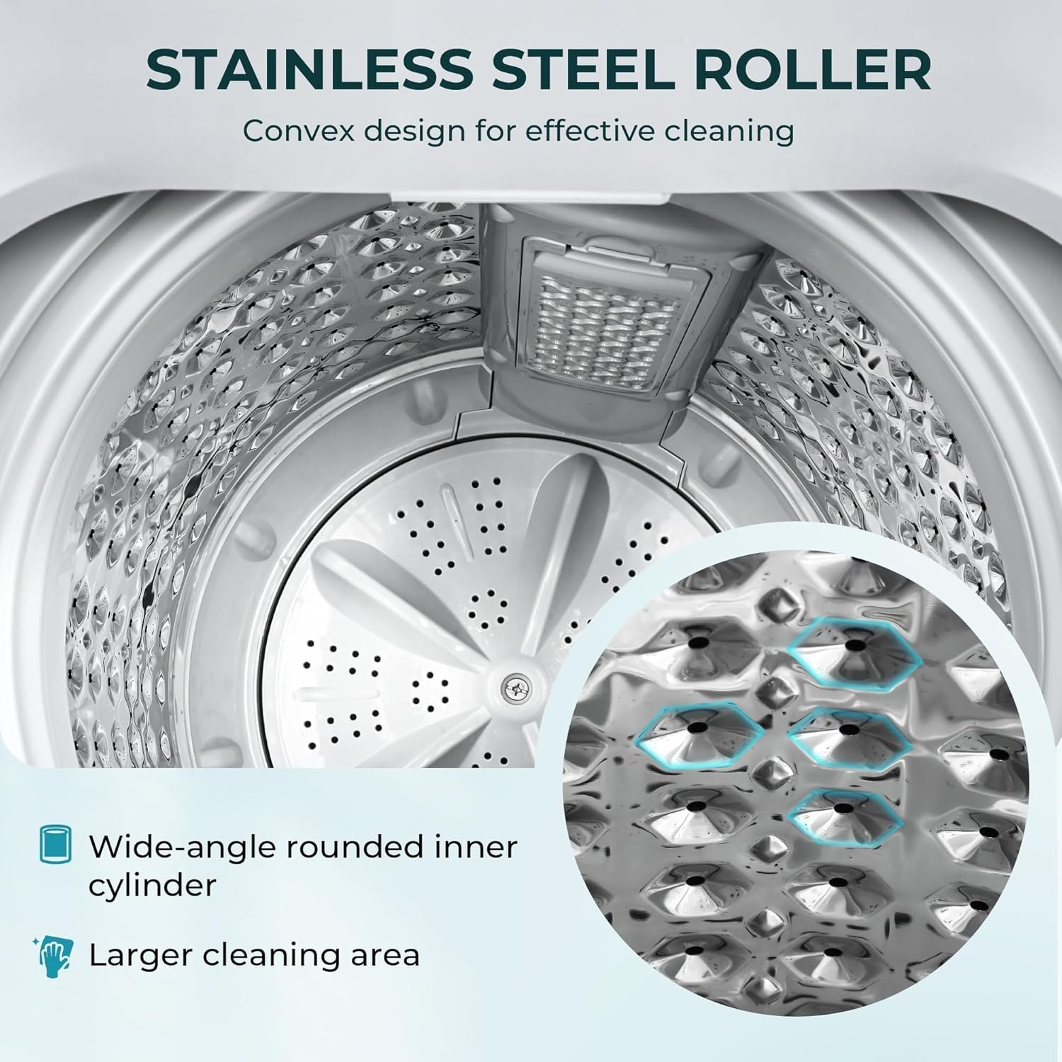 Protable and High Performance: Euhomy portable washing machine weighs 39. 6 pounds, 18.3*18.5*30.7 inches, and can wash up to 20 shirts or 4 jackets (reference data). The grooves on both sides of the machine are designed for easy movement and transportation. Stainless steel inner drum material is not easy to rust. This apartment washing machine has a built-in removable filter disk for filtering lint and pet hair.