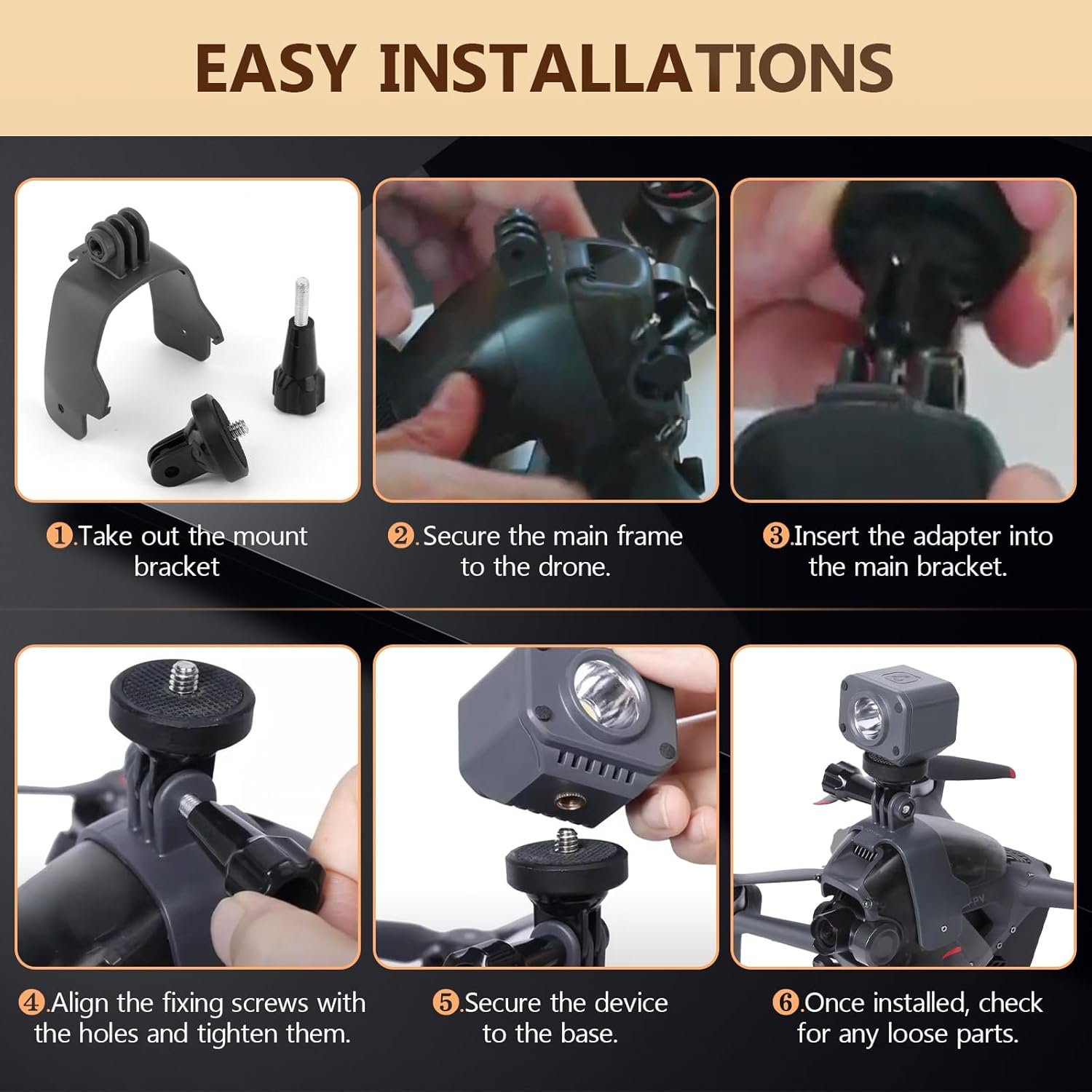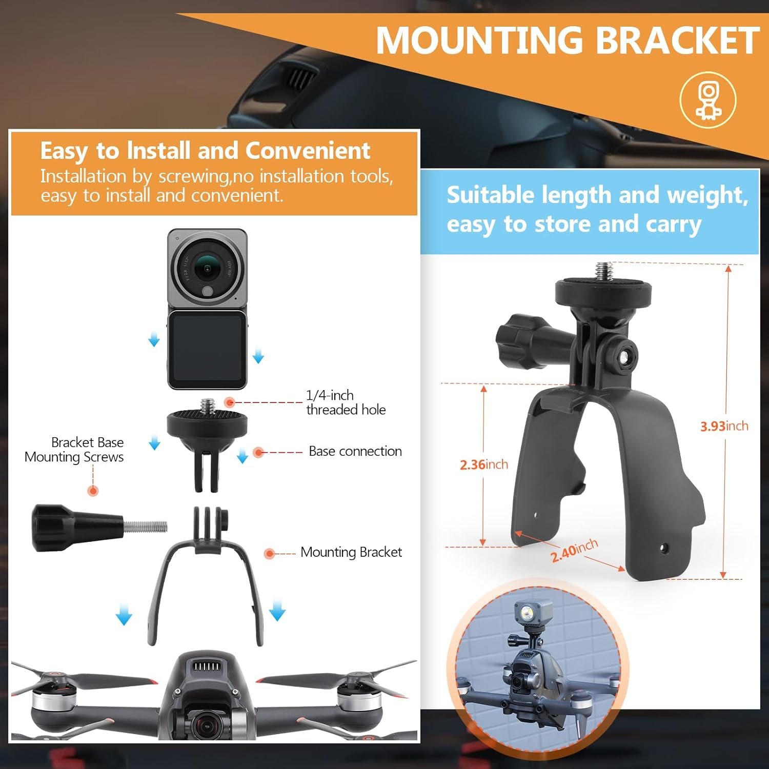 Easy to Install and Adjust: for DJI FPV Extension Bracket Searchlight installation process is simple and fast, without complicated tools or steps. At the same time, it supports angle adjustment function to facilitate the adjustment of the optimal shooting angle according to actual needs