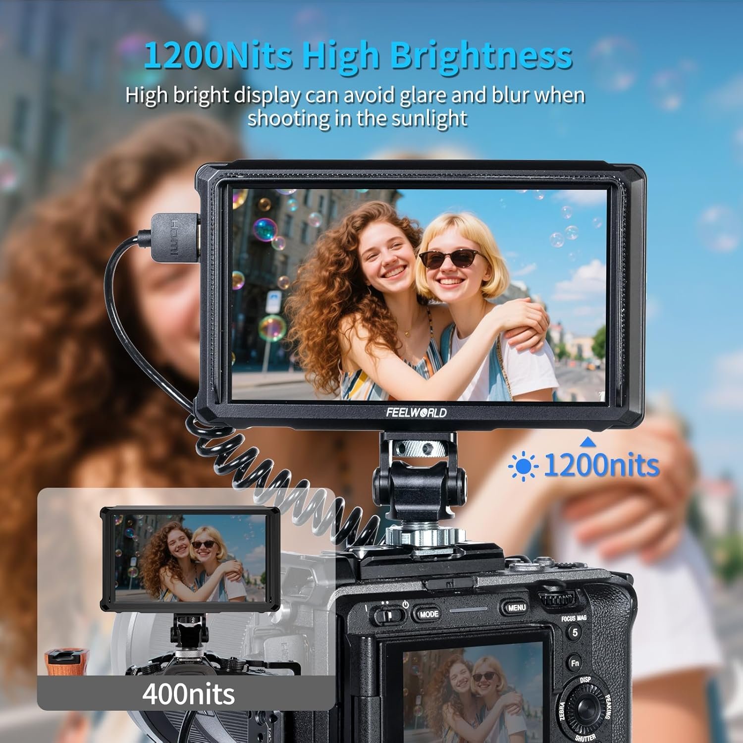 [1200nits sunlight readable screen]The FW568 Pro camera field monitor enable with 1200 nits high brightness Screen, with 6inch full HD 1920 x 1080 resolution, Wide 160° IPS viewing angle, 1000:1 contrast ratio.Only 0.45pouds lightweight ideal for outdoor works