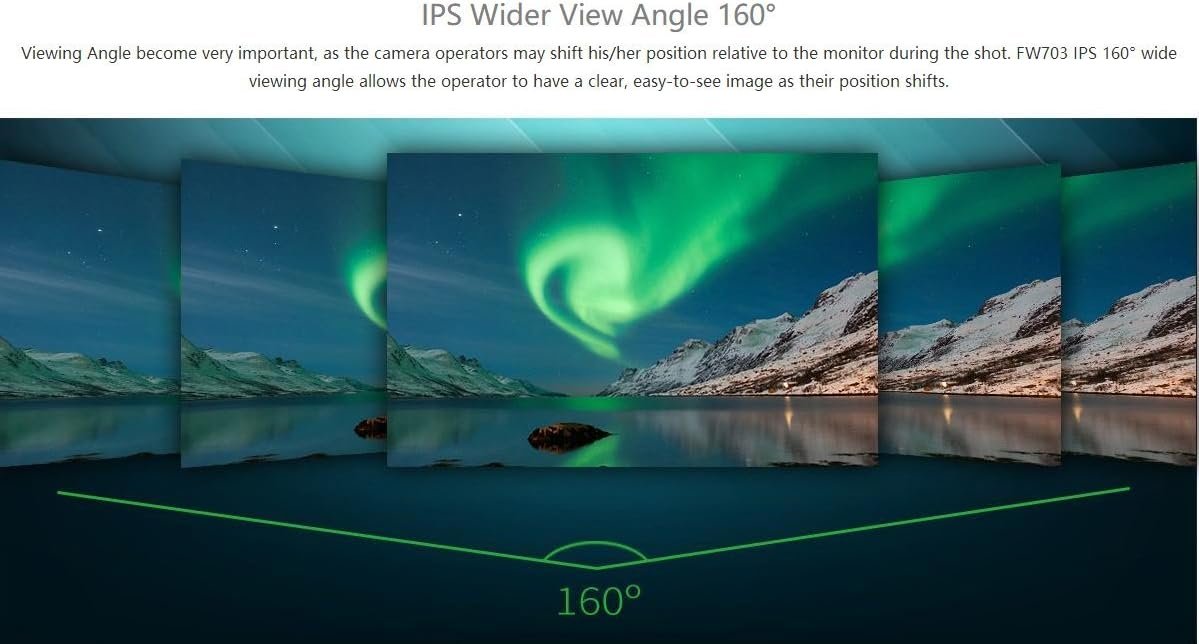High Quality:As the camera operators may shift his/her position relative to the monitor during the shot. FW703 IPS 160°wide viewing angle allows the operator to have a clear.