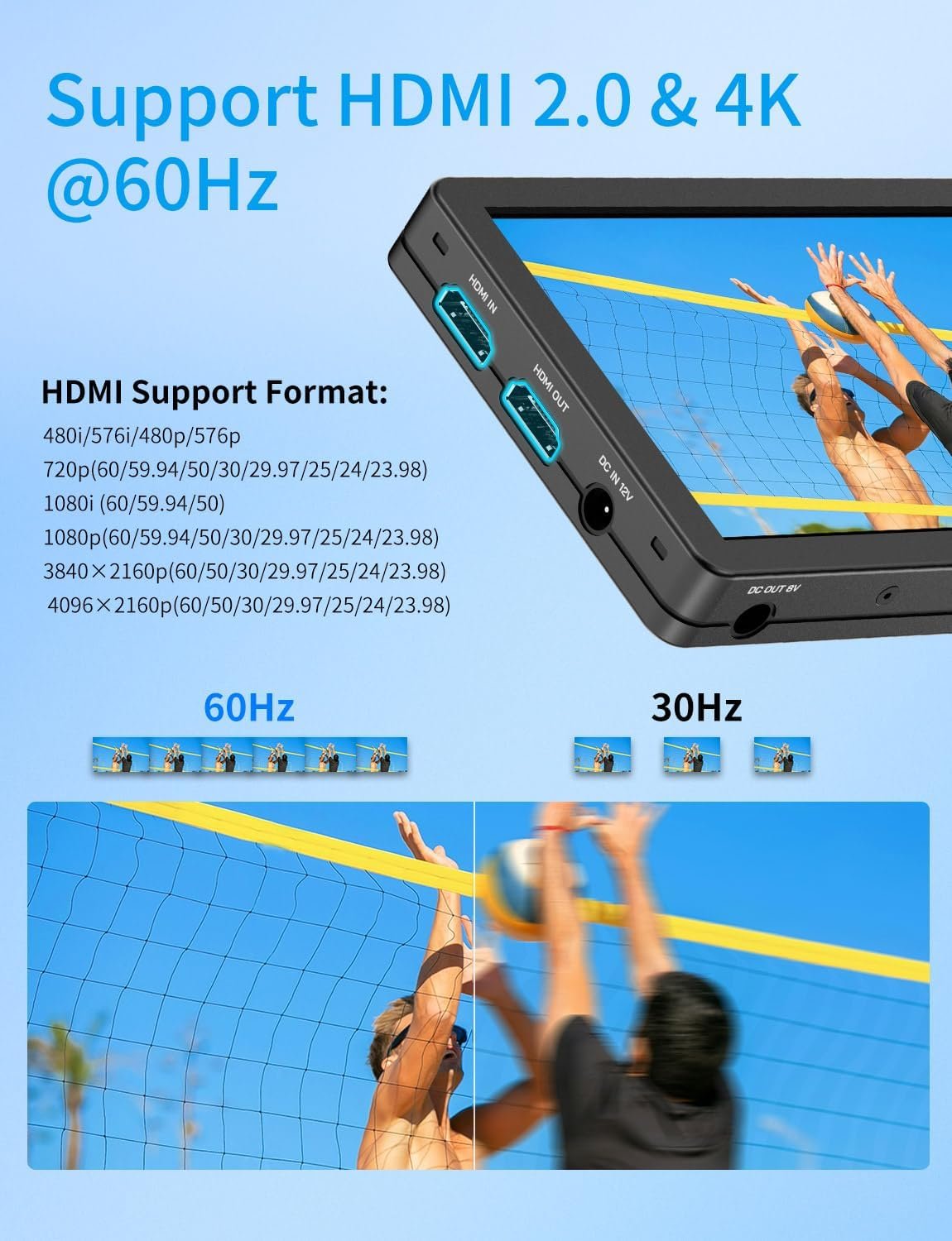 【HDMI Input and Output】Supporting 4K HDMI input and output up to 4096×2160/60p & 3840×2160/60p, T6 dslr monitor is compatible with mainstream camcorders and DSLRs, offering high-speed and stable signal transmission to ensure lossless image quality