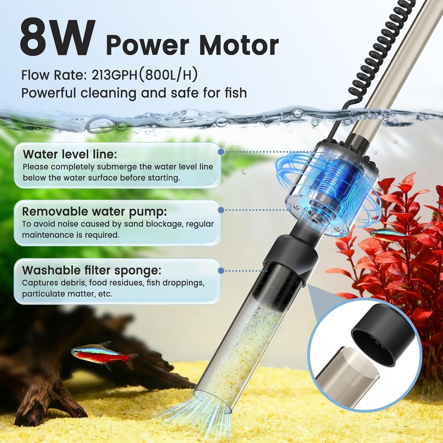 High Performance & Easy Maintenance:This fish tank gravel cleaner powered by an 8W motor delivering a max flow rate of 213 GPH. Strong Power ensures rapid water exchange and effective waste removal. Regular post-use cleaning is recommended to maintain suction power and prolong pump life.