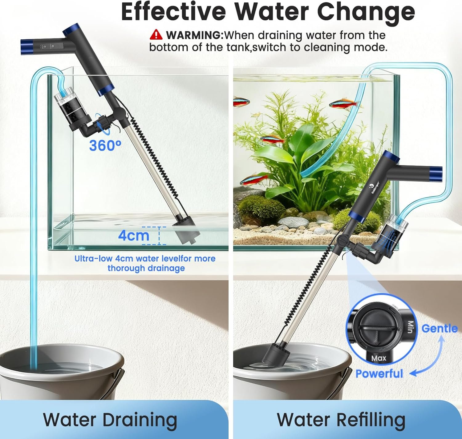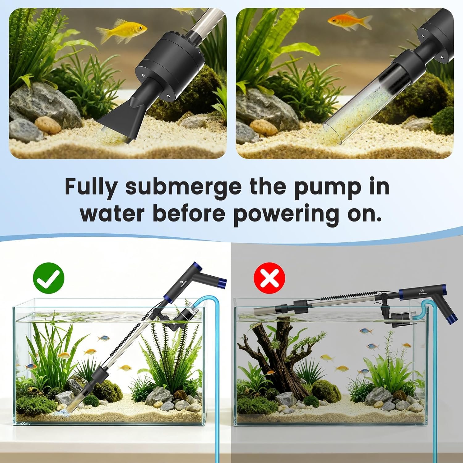 Ultra-Shallow Operation & Substrate Mode:This fish tank gravel cleaner vacuum operates in water levels as low as 2 inches; When using the siphon function (with the unit positioned below the tank level), engage the gravel vacuum cleaning mode to clean the substrate while draining water.(Always fully submerge the pump before powering on to prevent dry running)