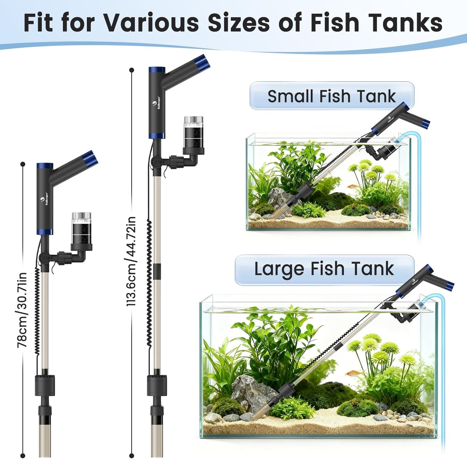 Extended Reach & Compatibility:This fish tank vacuum includes 1*intake tube and 2*extension tubes. Single-tube setup reaches 30.7 inches; dual-tube assembly extends to 44.72 inches. Adapts to various tank depths and water levels for optimized cleaning efficiency.