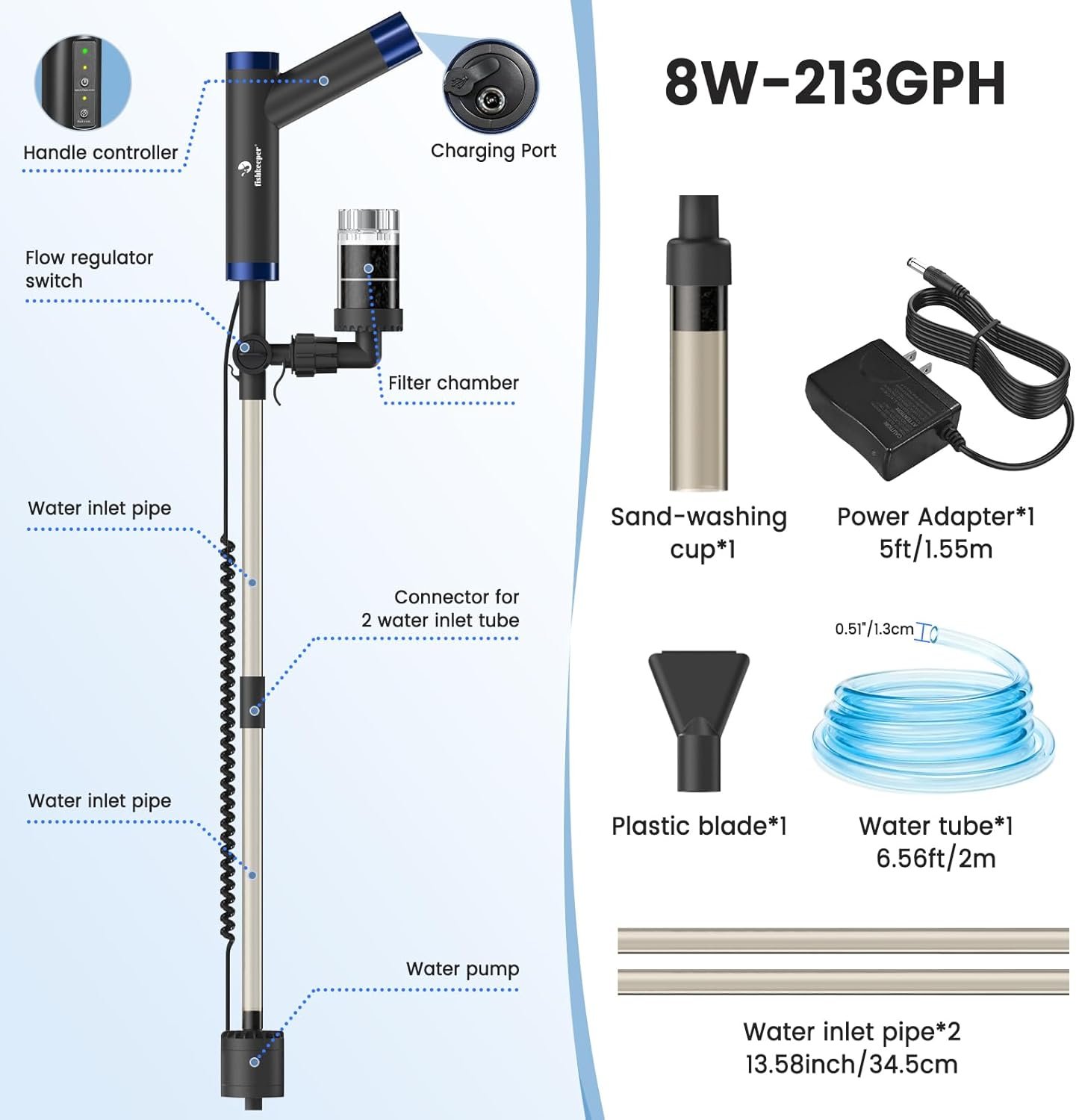 Cordless Rechargeable & Plug-In Modes:This electric fish tank gravel cleaner offers dual power options:Rechargeable aquarium cleaner vacuum for unrestricted portability and stable performance during extended cleaning sessions. Plug-in continuous operation with a 5ft power cord for uninterrupted power.
