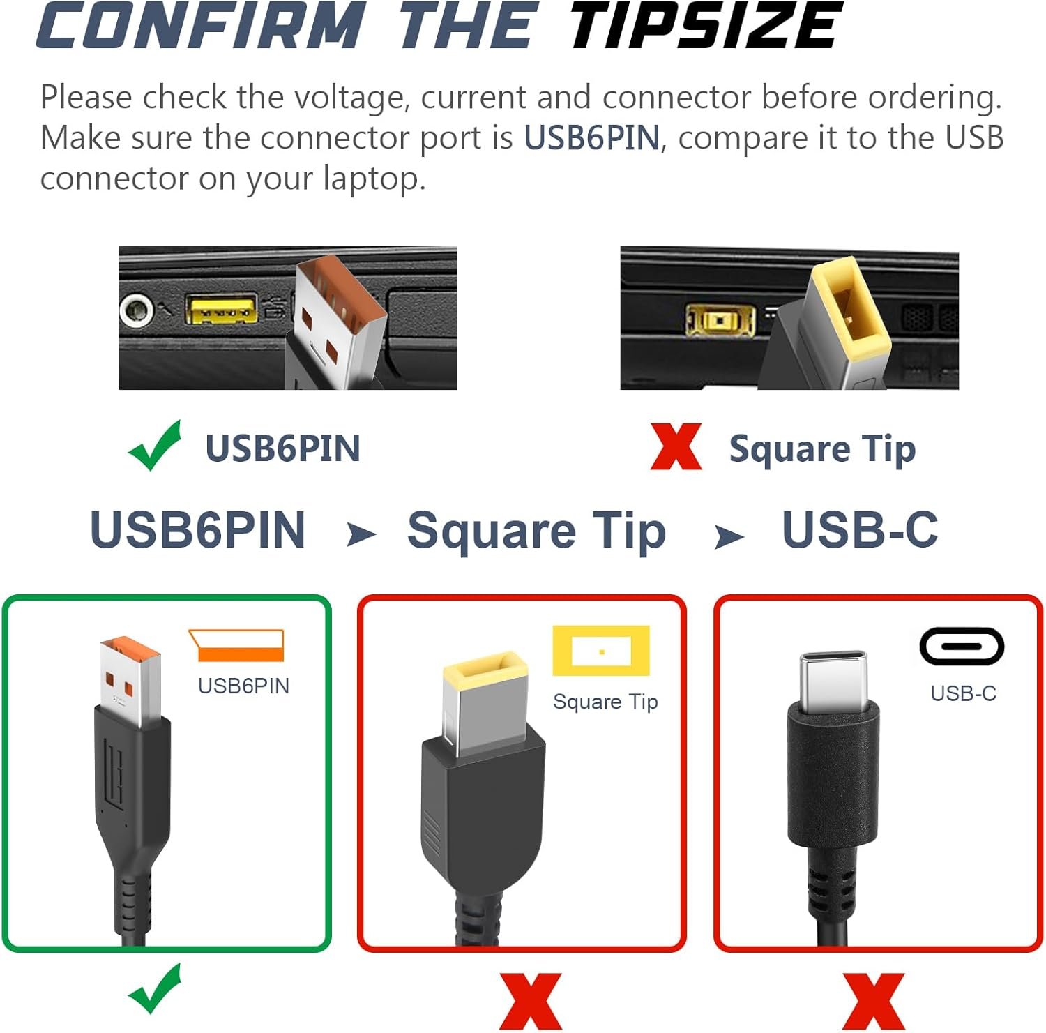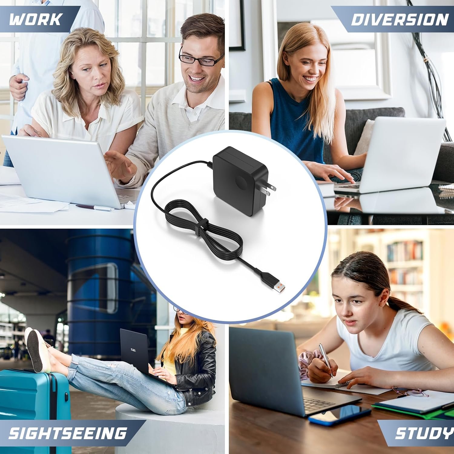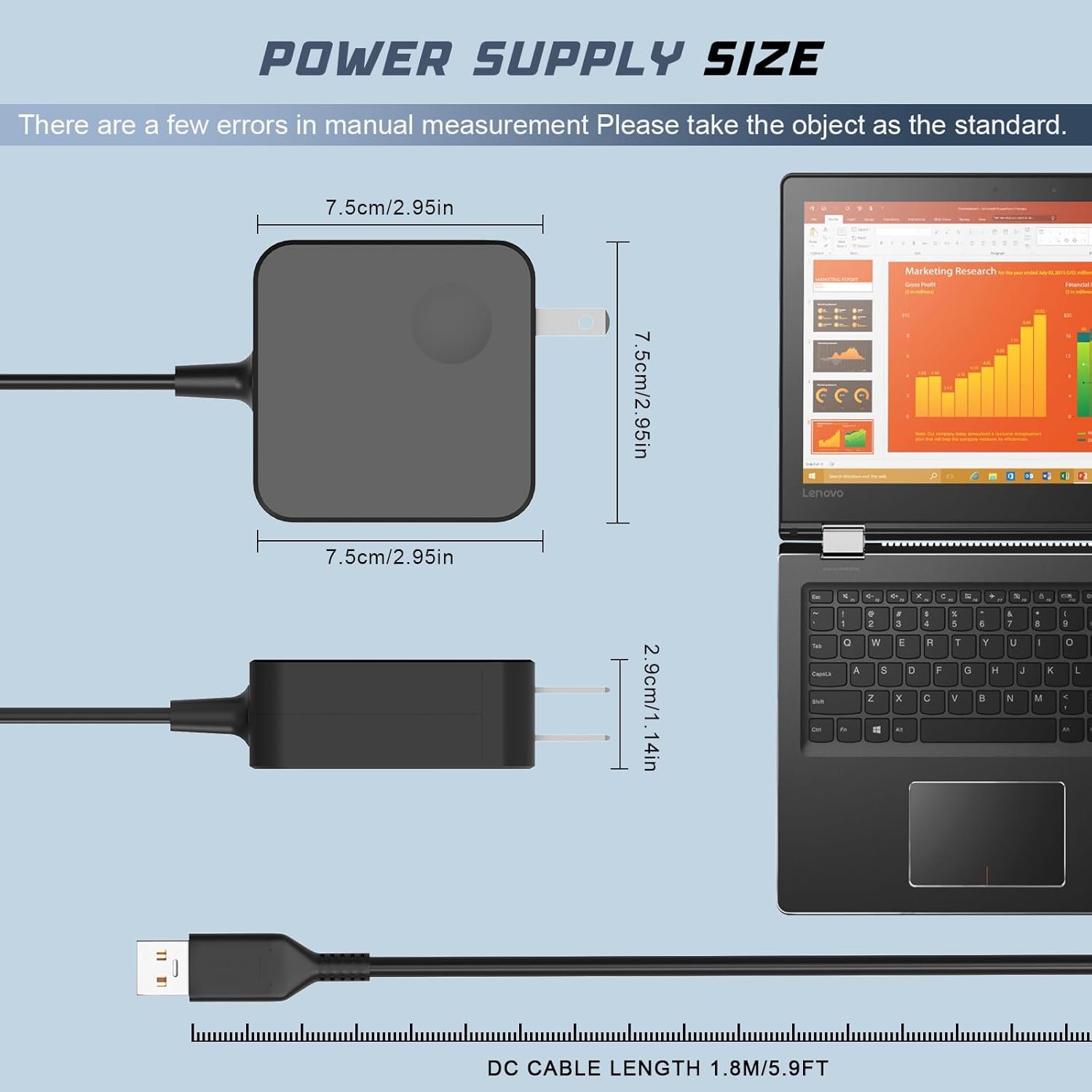 Input: 100-240V, 50/60Hz; Output: 20V 3.25A (for laptop) or 5.2V 2A (for phone); Power: 65W(Compatible with 40W Adapter); Cable length: 6.72ft (2m), Recharges device whether it’s on, off, or in sleep mode, it’s convenient for your working and traveling