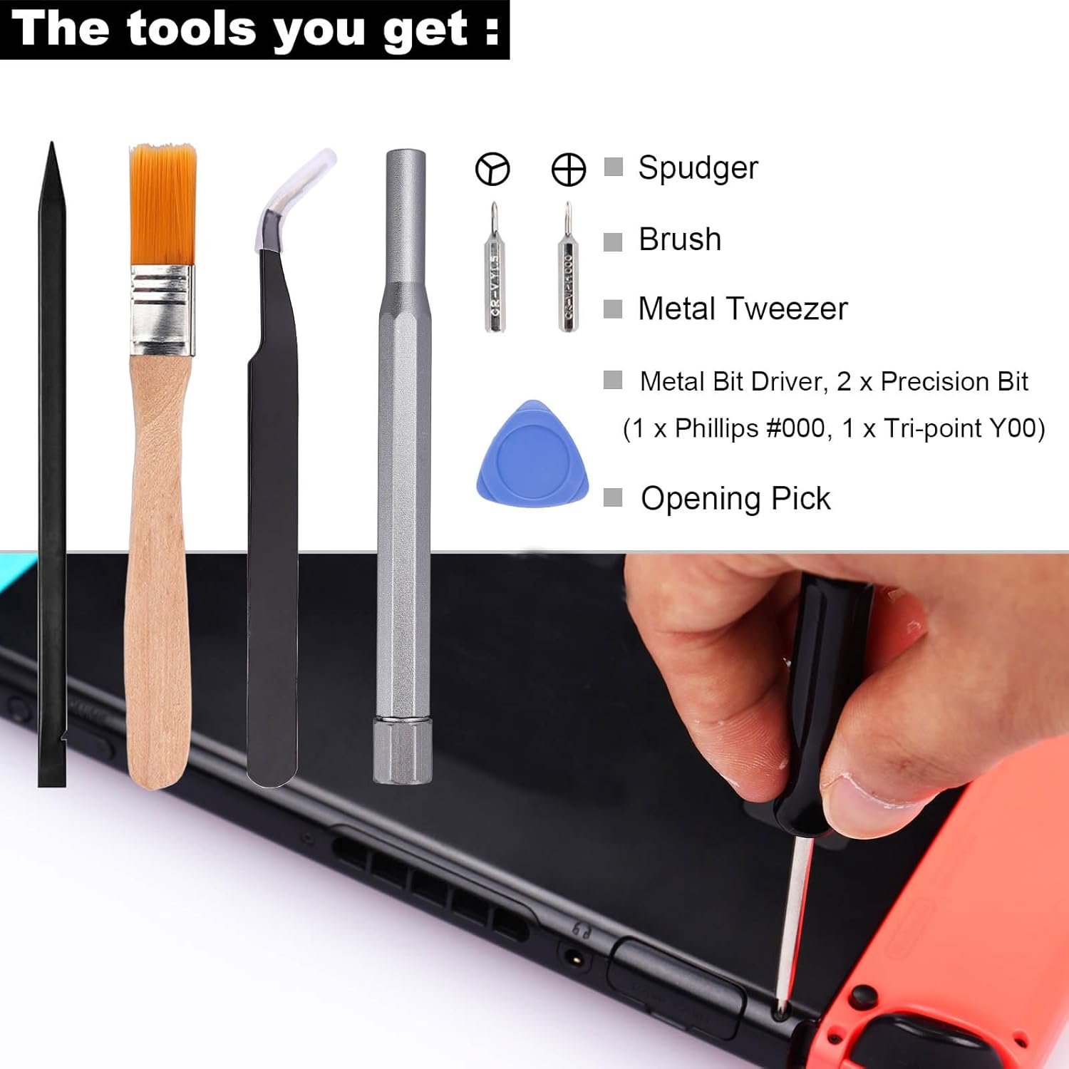 【8 x Console screw, Bit Driver, 2 x Precision Bit, Tweezer, Brush, Spudger, Opening Pick. 】Console Screws– 8 Reinforced back cover screws for Nintendo switch console witch will help you replace old, damaged or missing screws. Tools — A high quality metal screwdriver ensures no slippage. Tweezer, Brush, Spudger, Opening Pick helps you to easily disassemble the switch console.