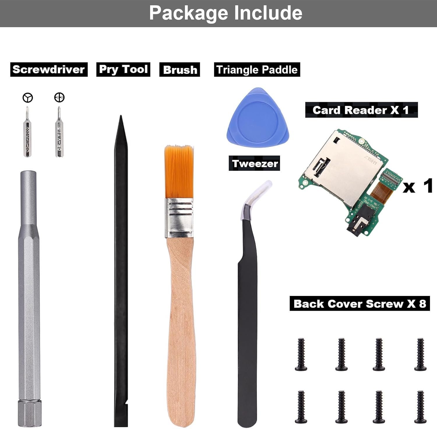 【What you get】Package include — 1 x Game Card Reader with Headphone Jack, 8 x Back Cover screw, 1 x Metal Bit Driver, 2 x Precision Bit(1 x Phillips #000, 1 x Tri-point Y00), 1 x Metal tweezer, 1 x Brush, 1 x Spudger, 1 x Opening Pick.