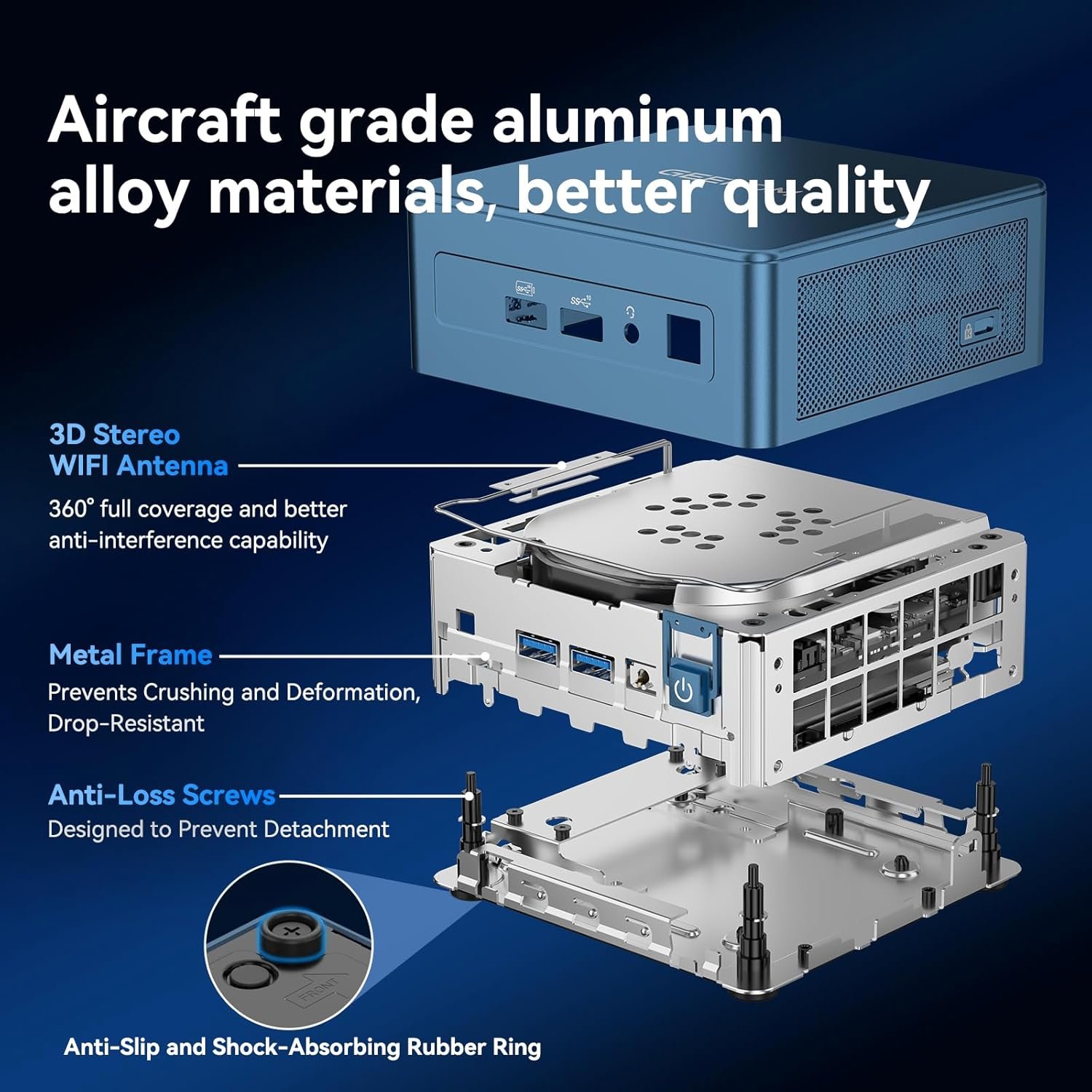 ➋ ABS+PC Composite Frame: Unlike the plastic frame found on most Mini computers, the it13 i9 mini desktop features a reinforced ABS+PC composite shell, a precision-machined metal frame, and baseplate, tested to withstand up to 440 lbs(200kg) of static pressure while maintaining optimal strength and heat dissipation. Tool-free upgrades, shock-absorbing feet, and a multi-directional antenna further enhance durability and wireless performance