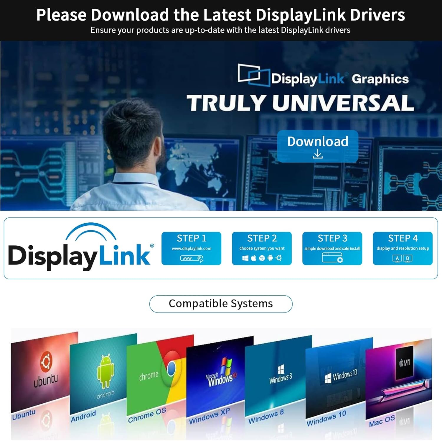 Hybrid 2 in 1 USB to HDMI adapter Universal Compatibility: Has USB 3.0 or USB C cable port match most computer, easily connect to USB-C or USB 3.0, USB 4.0, Thunderbolt 3/4. Work with windows 7/8/8.1/10/11 or higher, Mac OS 10.10 or Above, Chrome OS, Android 7.1 Above with OTG function. (Note: You need to download and install the latest version of displaylink driver. Not Plug and Play)