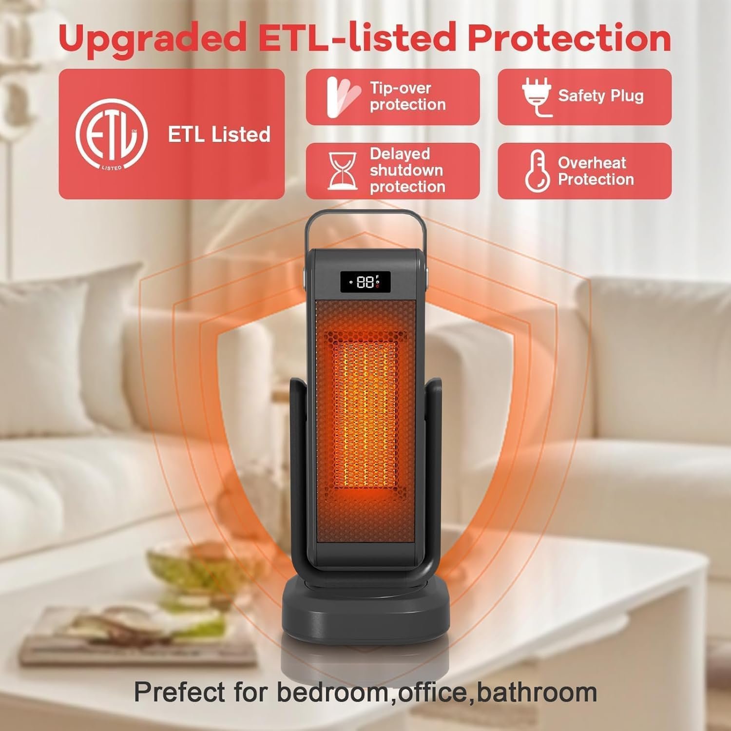 【More Upgraded Protection & Multi-Function】Our space heater has ETL-listed protection, including tip-over, overheat, and delayed shutdown protection. If accidentally knocked over, the built-in tip-over protection will automatically turn it off, allowing children to play freely at home while enjoying warmth. It has four heat modes, 3D oscillation (60° up and down and 90° left and right), is ultra-quiet at 35db. You can switch to ECO mode to adjust the thermostat (41-95℉) and set a timer (1-12h).